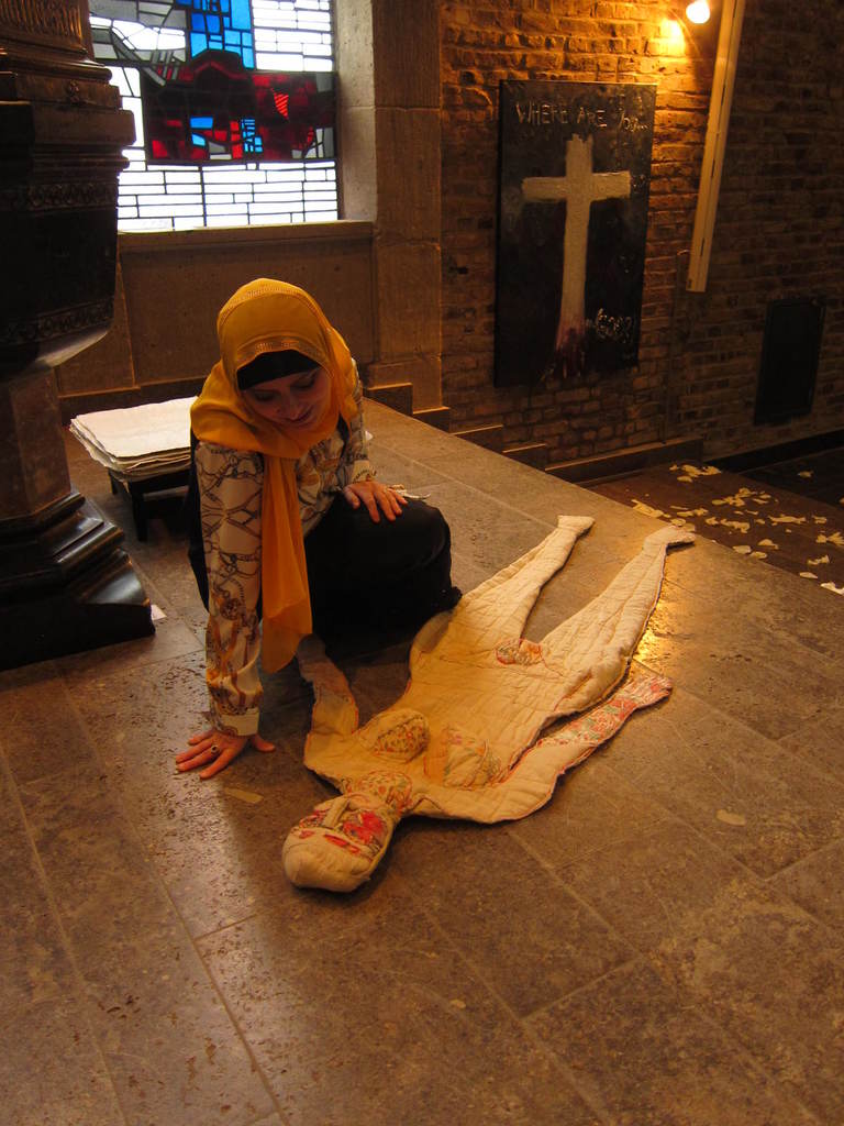 bezoekster bij "vrouwenhuid", detail installatie "Maria hidingplace"