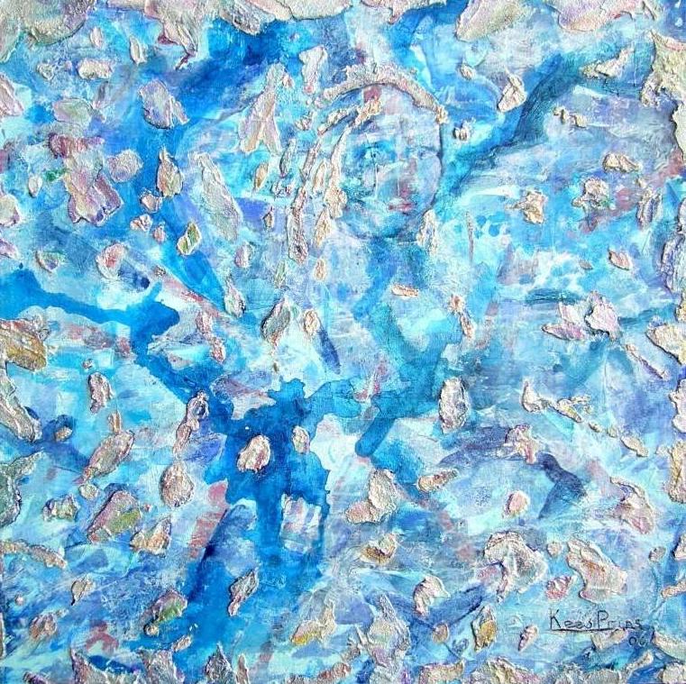 Een schilderij met veel lagen als ondergrond. Door de transparantie zit er veel diepte in. Opeens zag ik het gezicht en heb dit lichtjes naar voren gehaald. Afgemaakt met specie en zilver/parelmoer effecten.