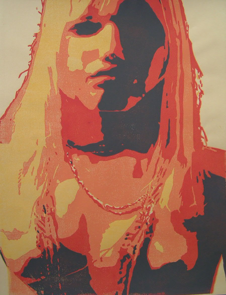 Een linosnede in warme kleuren van een mooi meisje uit de hippietijd . Zonder passepartout in een alumiumlijst.