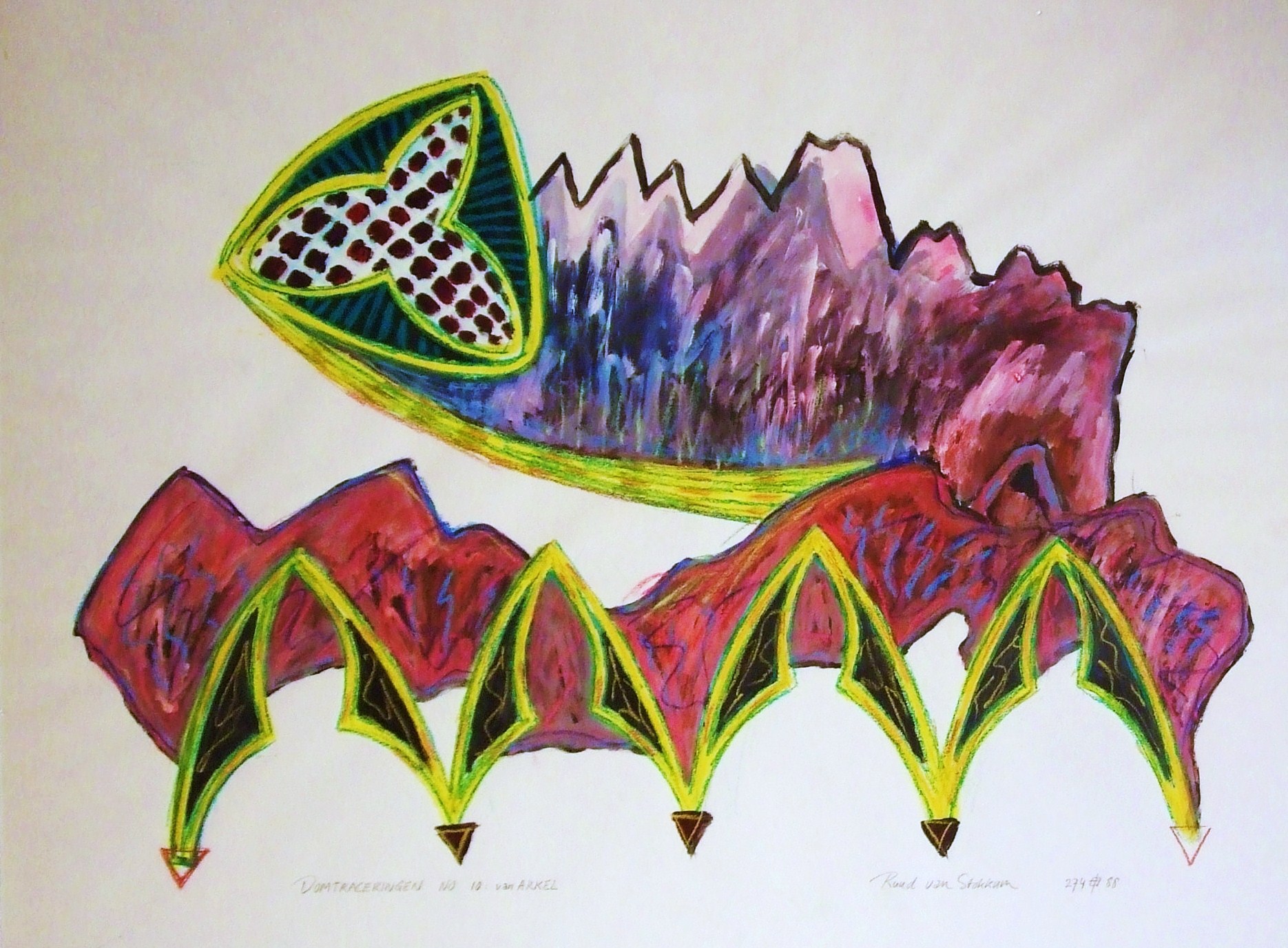 Dom Utrecht: improvisatie op tracering ARKEL met acrylverf en pastelkrijt.