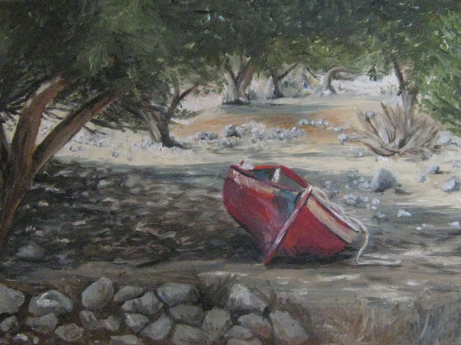 Een verlaten roeiboot tussen de olijfbomen.