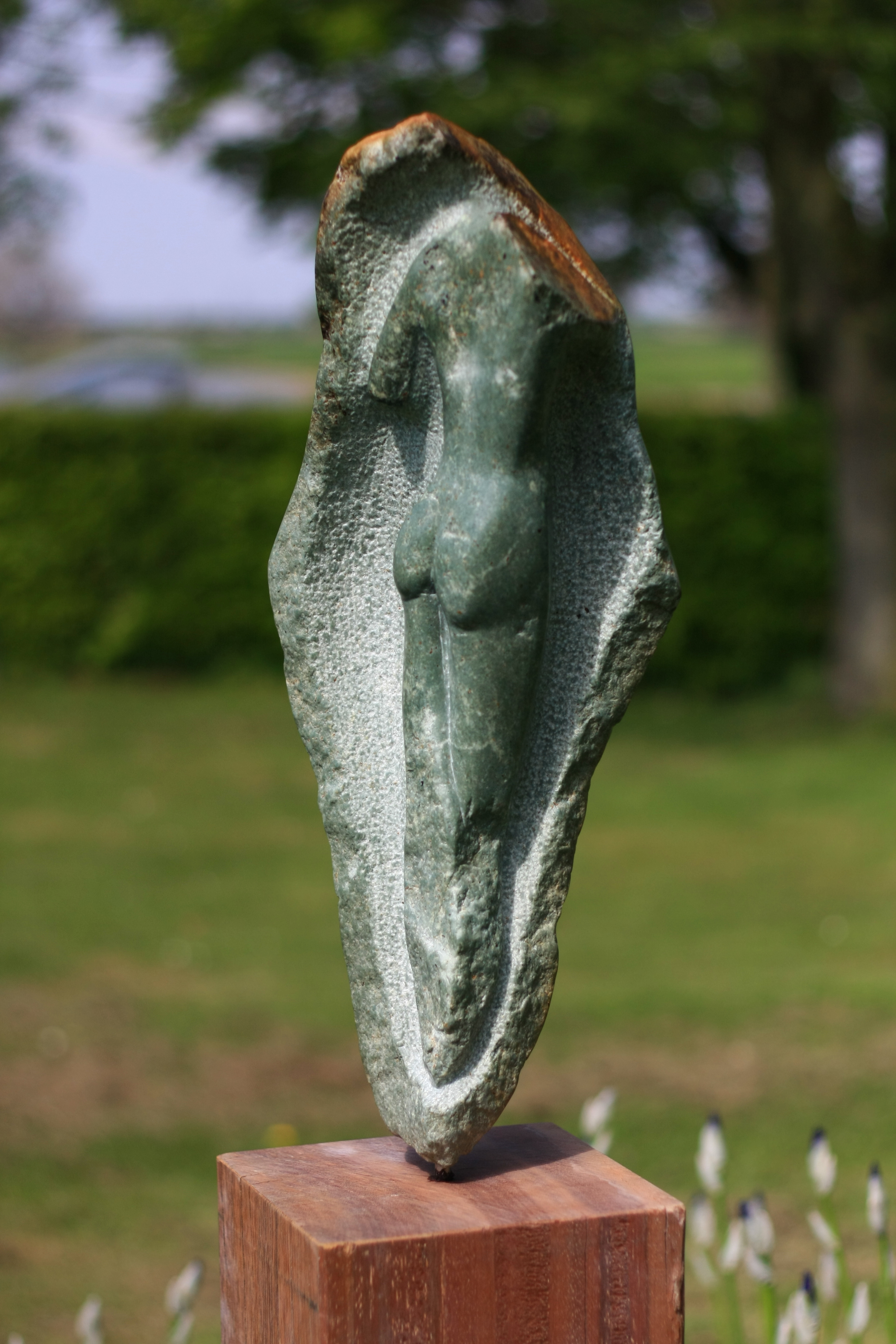 Dit beeld is gemaakt van groene opaal (serpentijnsoort) en geschikt voor buiten. Prijs excl. sokkel. Het heeft 2 kanten. Een symbolische 'schelp' aan de ene kant. Aan de andere kant een vrouw. Verschuilt ze zich, of ontsnapt ze juist? Zodra ze de schelp verlaat, verdwijnt ze in ieder geval in het niets. De symbolische schelp, haar imago, de indruk of herinnering die ze achterlaat, blijft. Ik noem het: In beeld. Maar je kunt er veel titels aan geven: Uit je schulp kruipen. Ontsnapping. Bevrijding. Transitie. Afscheid. Herinnering.