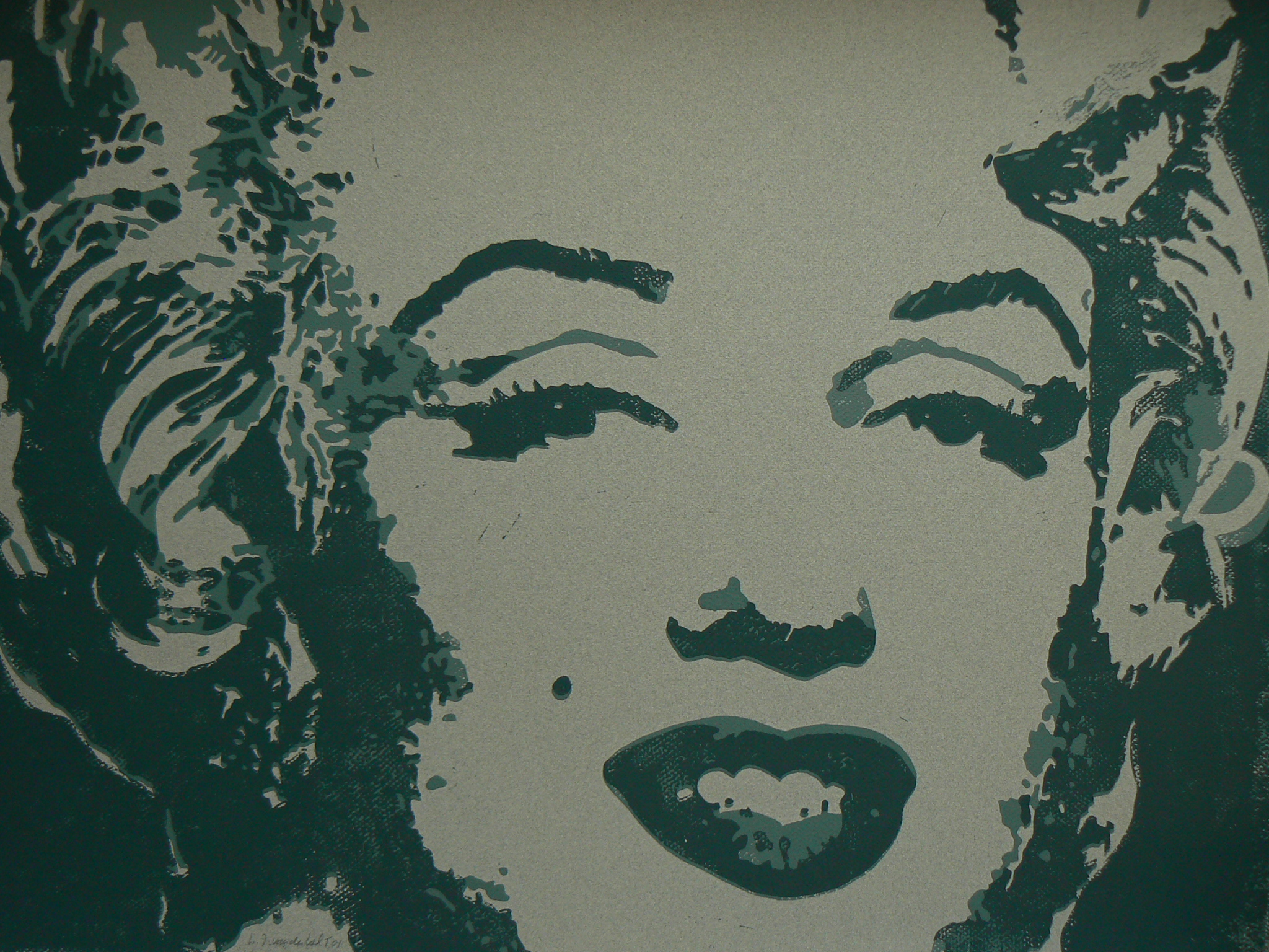 Een tweekleuren (de derde kleur is van het papier) linosnede van Marilyn Monroe in de stijl van Andy Warhol. Duidelijk is de kleurstelling eigen keuze. Oplage was drie stuks. Wordt geleverd met aluminium lijst, zonder passepartout.