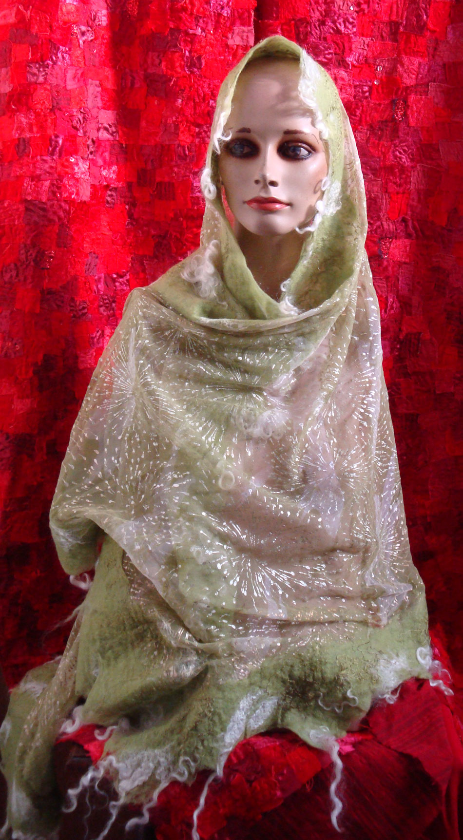 Stola van zijde, groen met goud aan de ene kant de andere kant is groen met zilver. De randen zijn gevilt met groene wol en lokken.