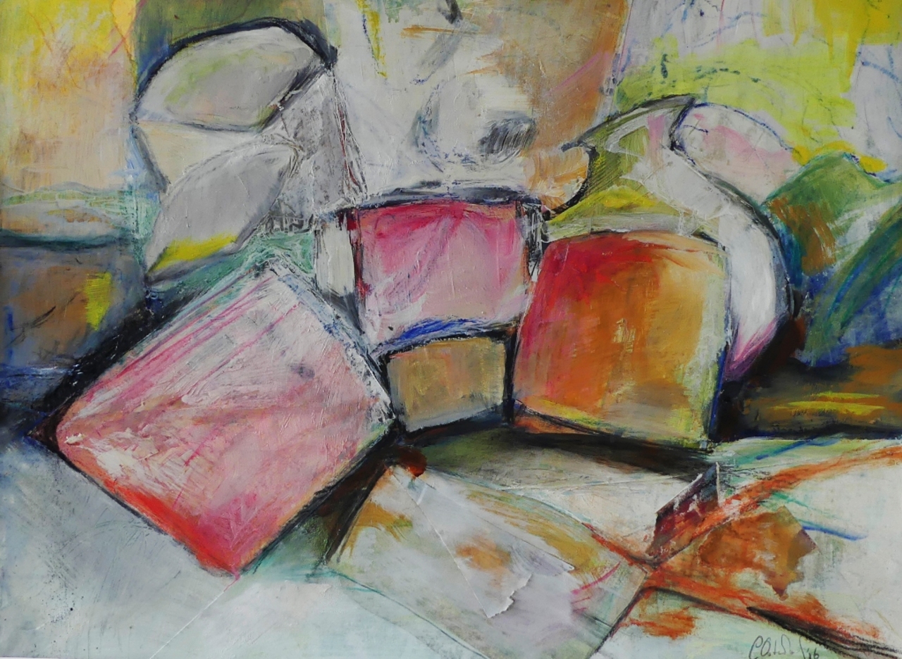 De compositie (ontstaan in een groeiend creatief proces met verschillende technieken) suggereert een ruimtelijke werkelijheid die je als toeschouwer uitnodigt tot het geven van een eigen interpretatie.