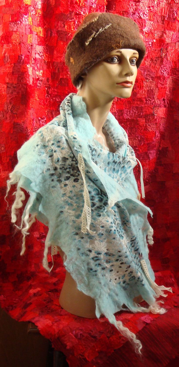 Sjaal kant daarop zeegroen en witte wol gevilt. kantjes en linten.