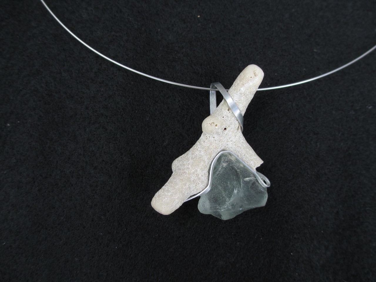 Een stukje koraal uit een oude verzameling is gecombineerd met een stukje door de zee gezandstraald glas. Het aluminium verbindt de twee elementen op een bijzondere manier waardoor noch het glas noch het koraal aangetast wordt.