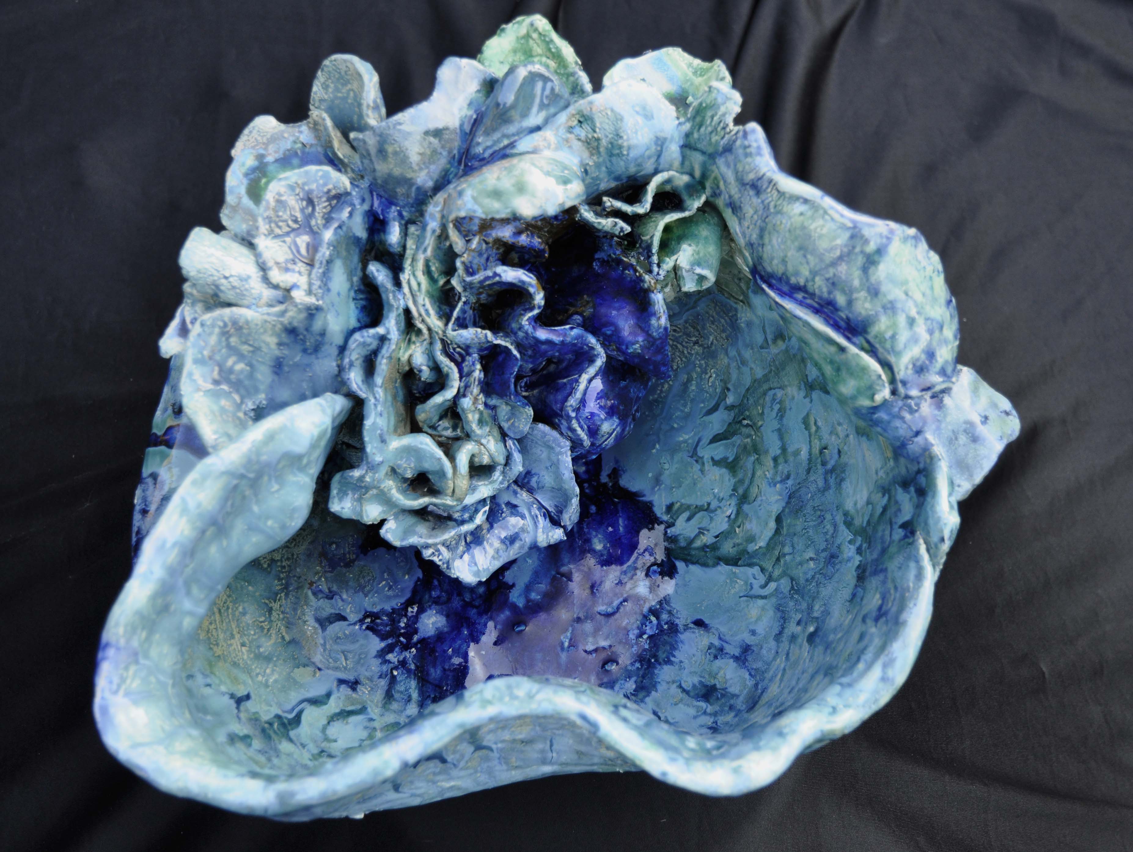 keramische vaas, vrije vormgeving, met glas geglazuurd in de kleuren blauw/turkoois