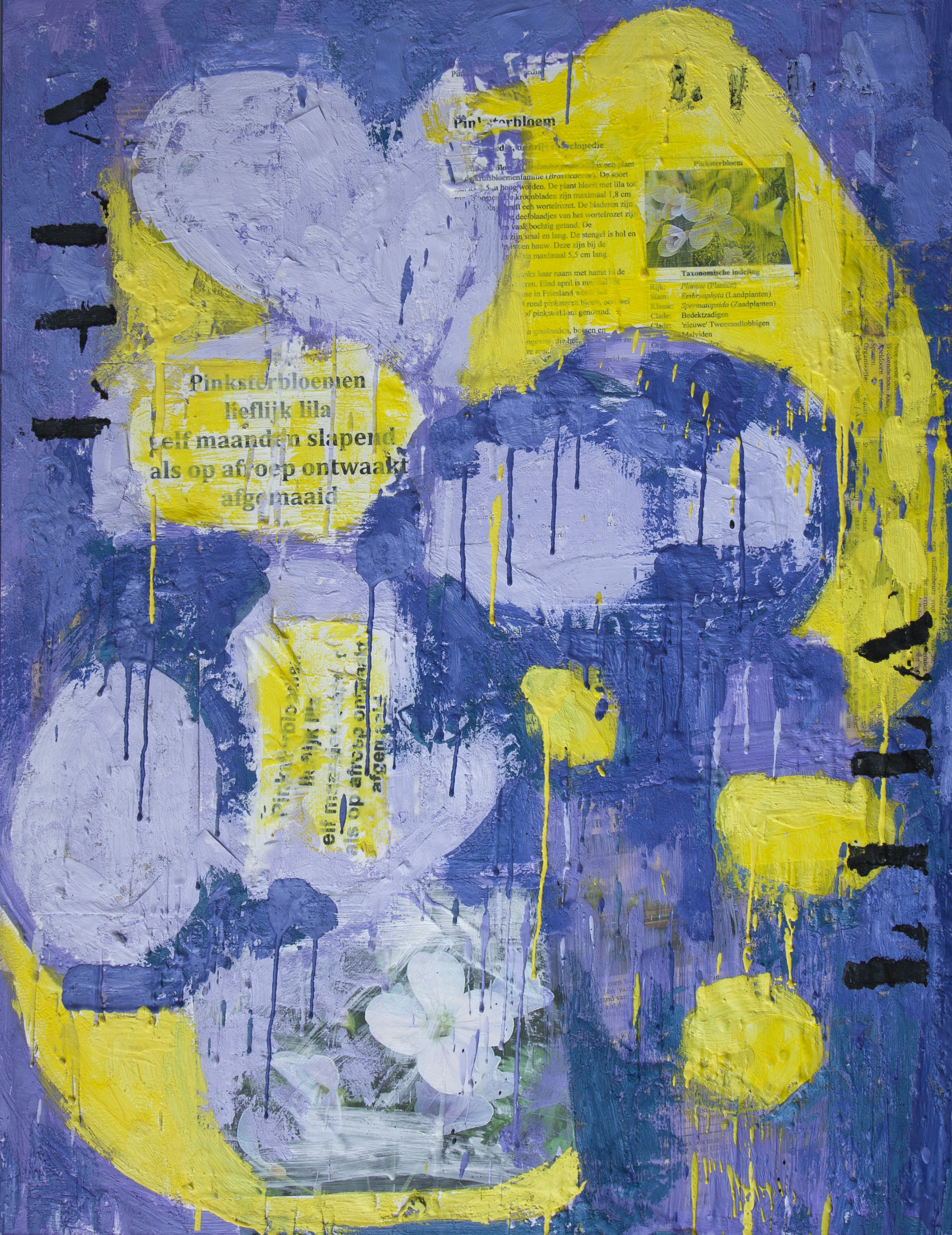 bijenwas met pigment a la Jasper Johns. De inspiratiebron was de techniek en de aanleiding een gedicht over pinksterbloemen..