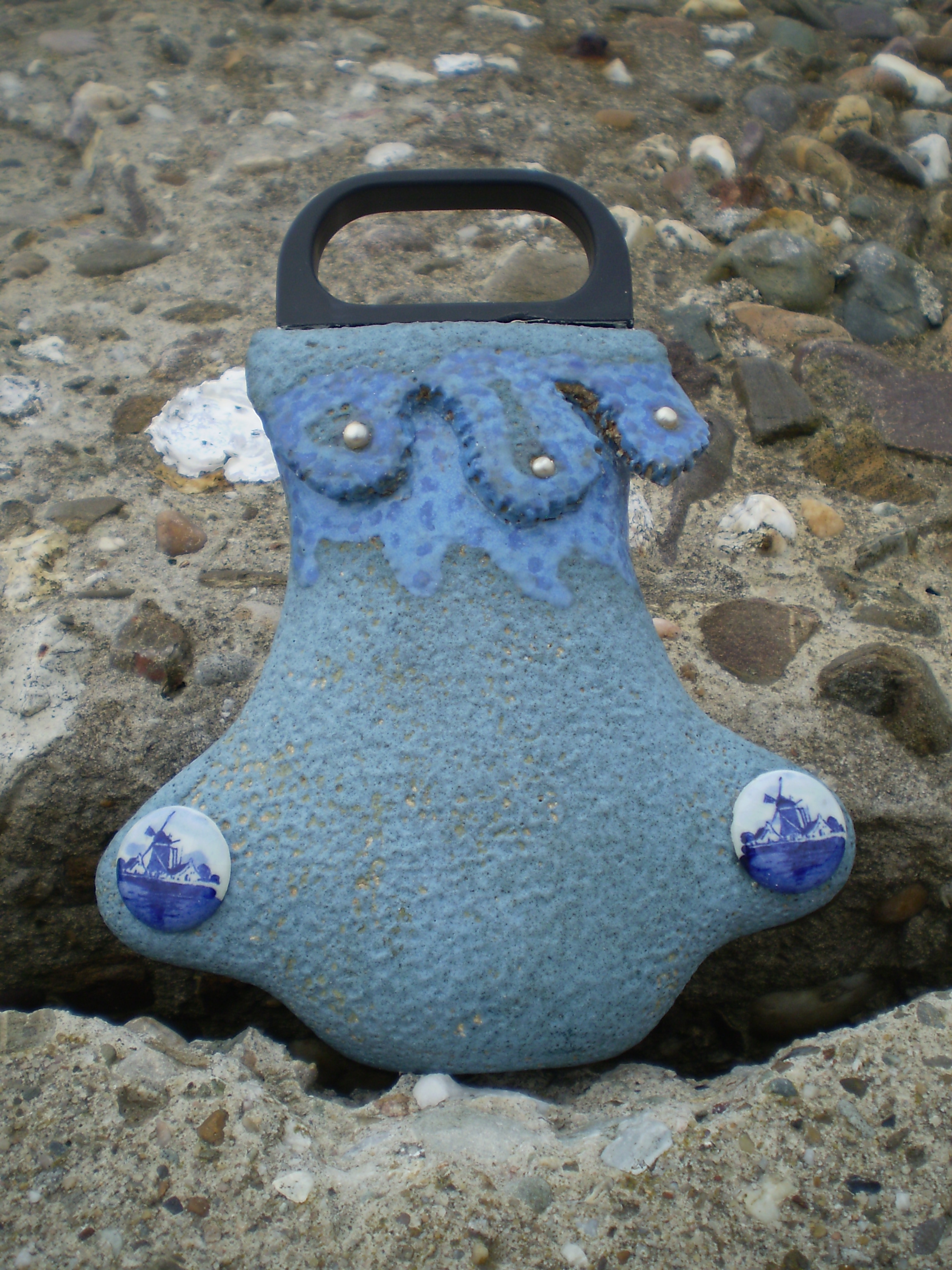 Tas, handgevormd, bewerkt met engobes. Plastic handvat.