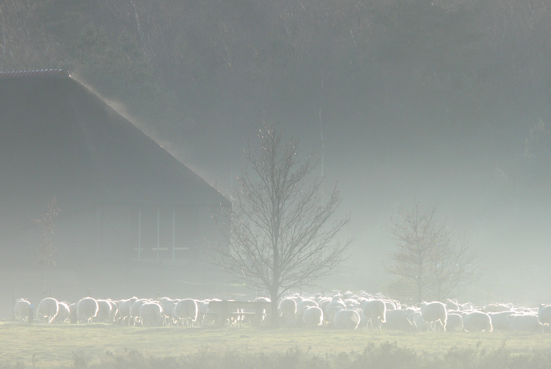 Aan het einde van een zonnige maar koude winterdag op de Veluwe zijn de schapen aangekomen bij de schaapskooi.