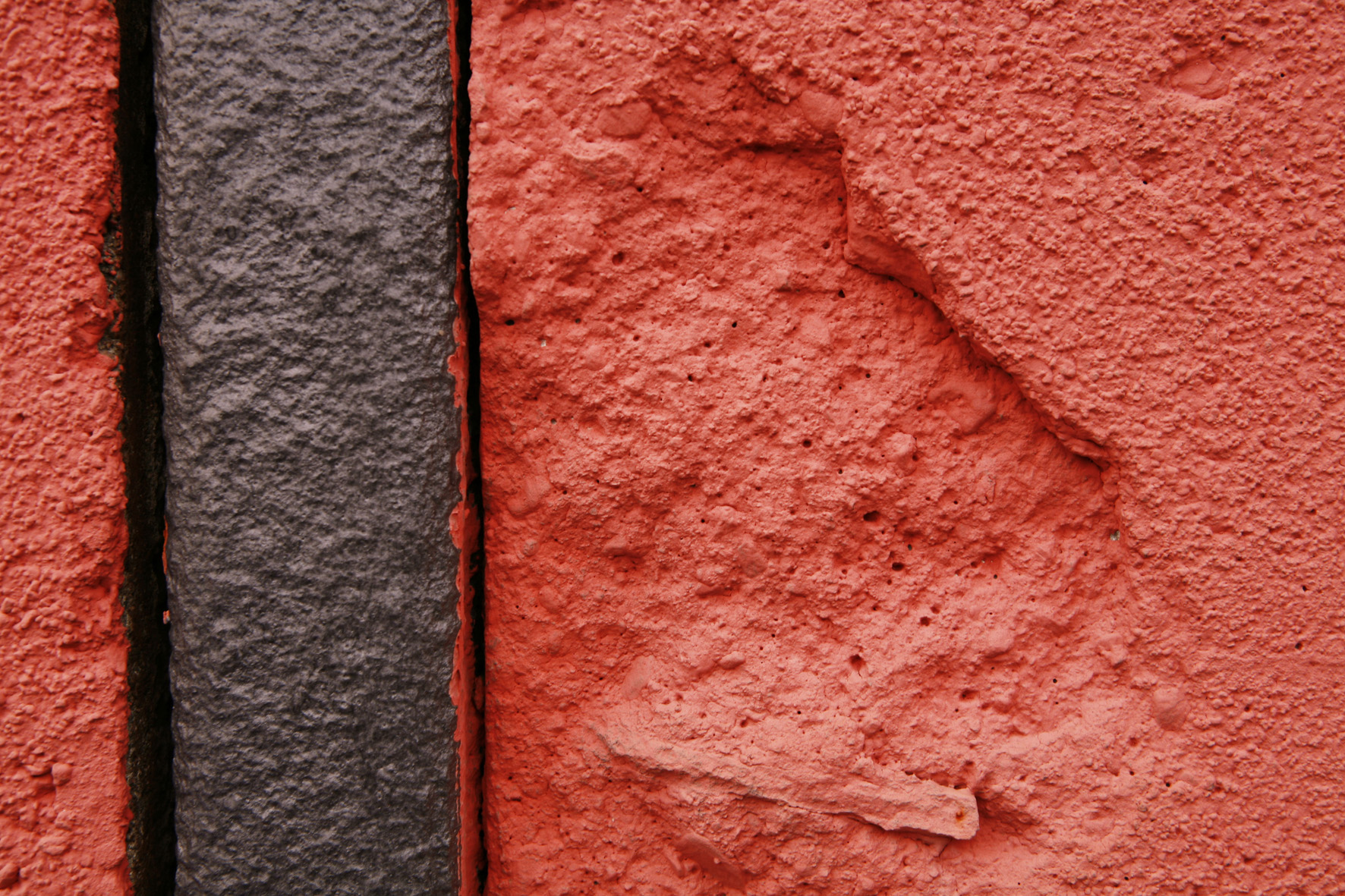 Door de vertikale zwarte balk vormt dit detail van een rode muur een minimalistisch beeld.