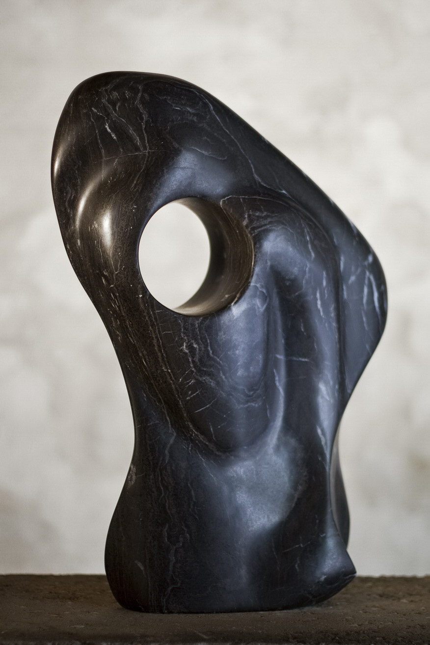 Zwarte Albast met prachtige lijnen van witte aders Doorboring in massieve vorm. Lijnen en volumes van het menselijk lichaam. Aan de ’achterzijde’ een ’8-lijn‘ zichtbaar als symbool voor het doorgaande leven (Lemniscaat).