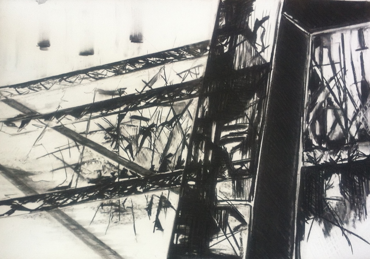 Houtskooltekening geinspireerd door beelden uit een industriele omgeving.