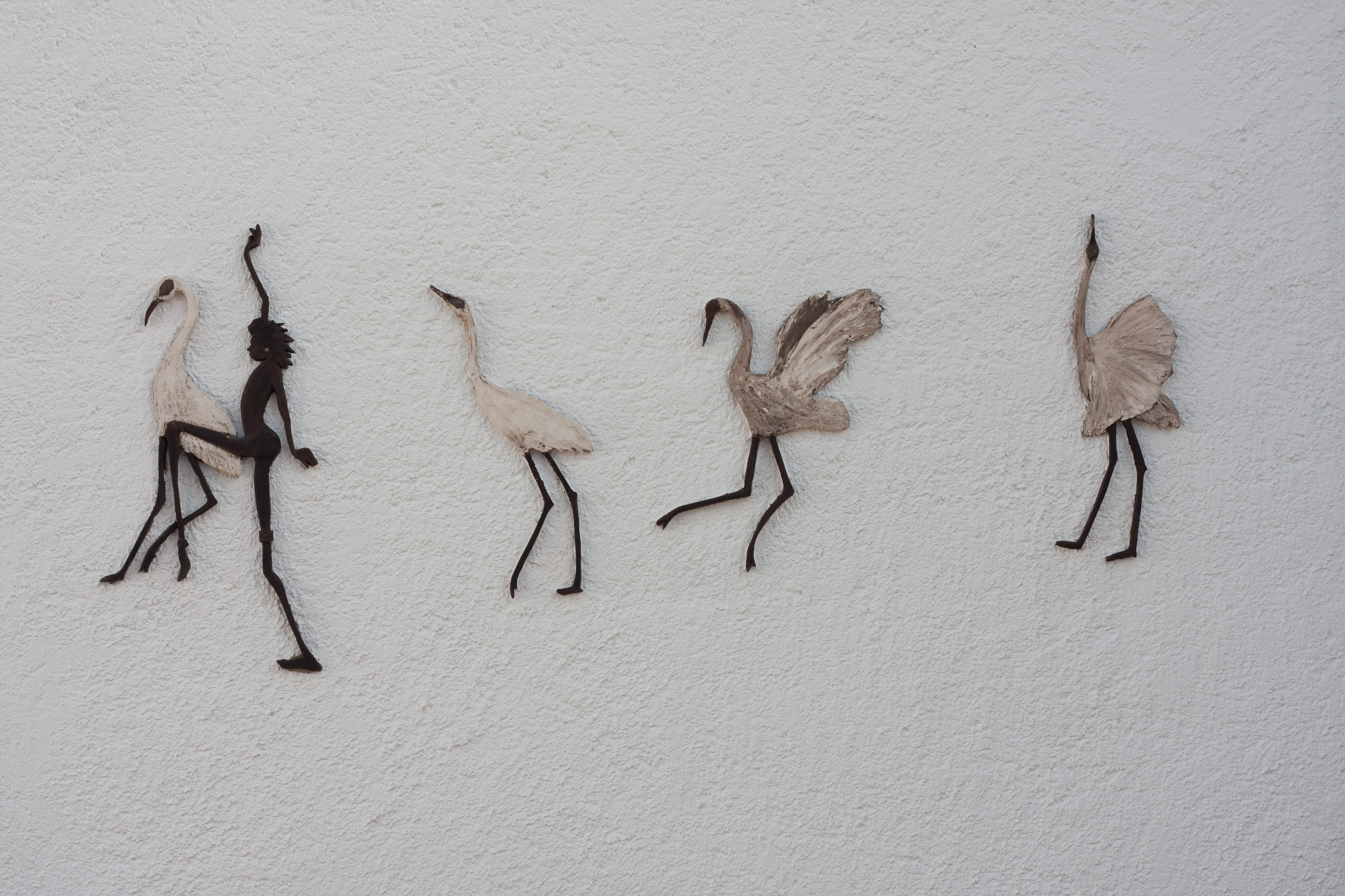 Samenspel van kraanvogels en de aboriginal danser. Losse delen die daarna met snel-cement op de buitenmuur bevestigd zijn en als het ware een schilderij vormen. De afmeting betreft het totale wanddecoratie.