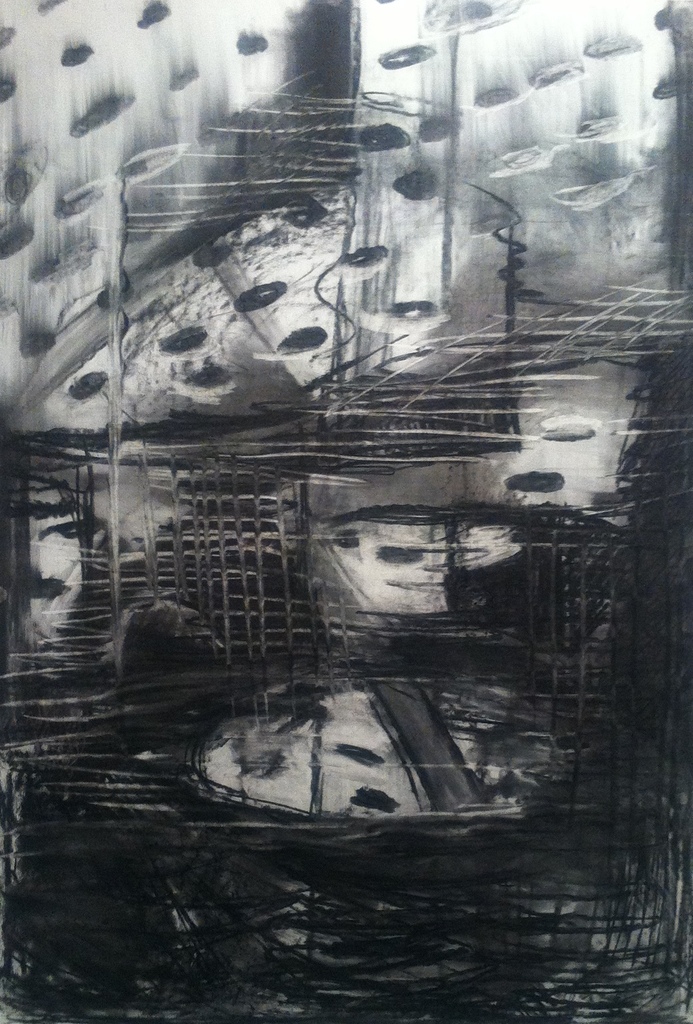 Houtskooltekening geinspireerd door beelden uit een industriele omgeving.