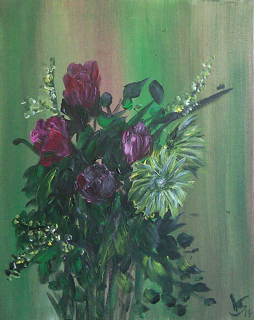 Een snel bosje bloemen nat in nat in acryl, fantasiecompositie.