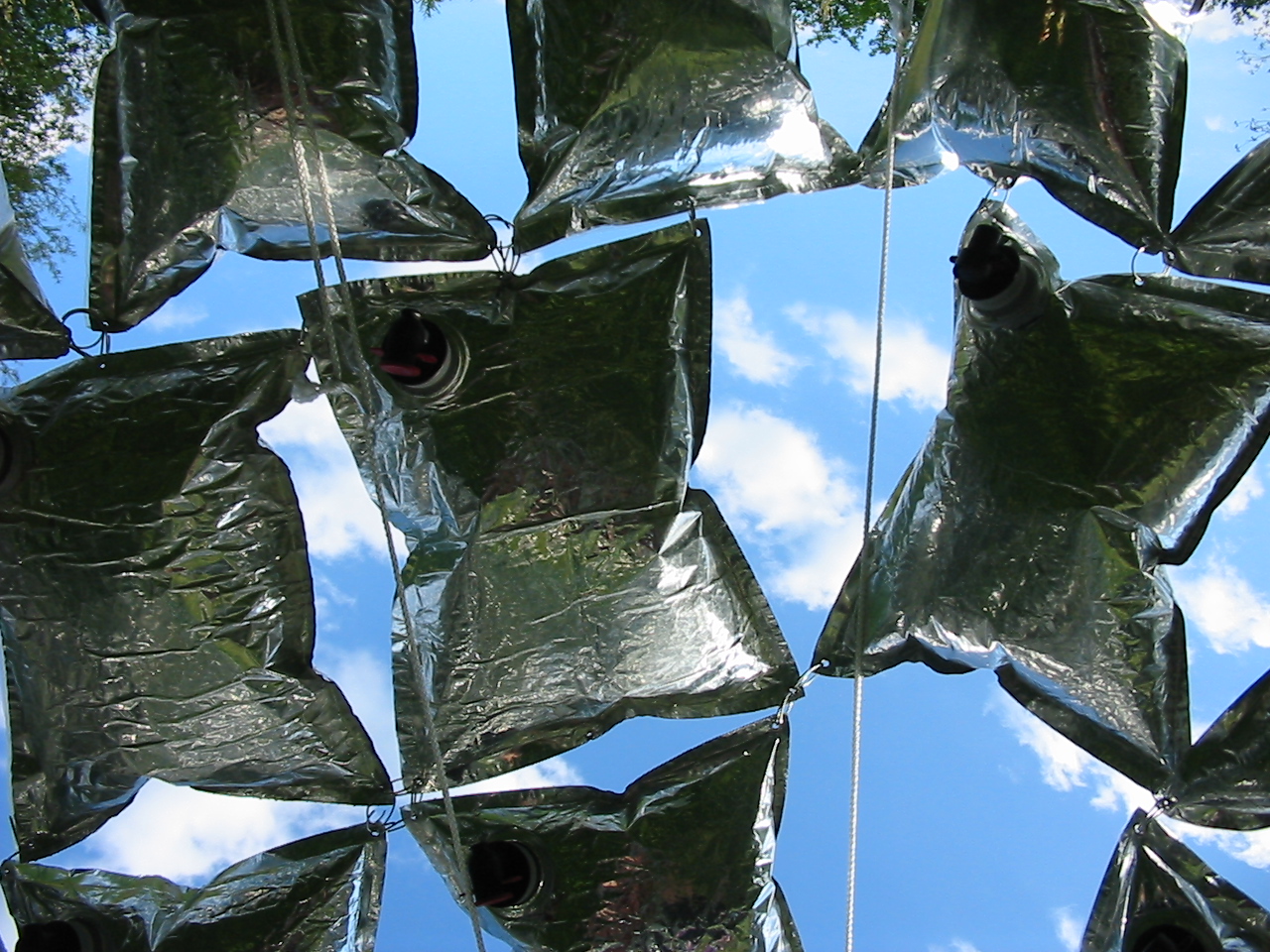 Heaven on earth ! Een prachtige 'de Waar' tent waarvan alleen het frame is gebruikt. De tent is opgebouwd uit lege wijnzakken met binnenin een bedje en een sonde aangesloten op volle wijnzakken. Je kijkt omhoog naar de glimmende wijnzakkussentjes en ziet daar tussendoor de strak blauwe lucht, wolken en zon ....en laat je vol lopen.