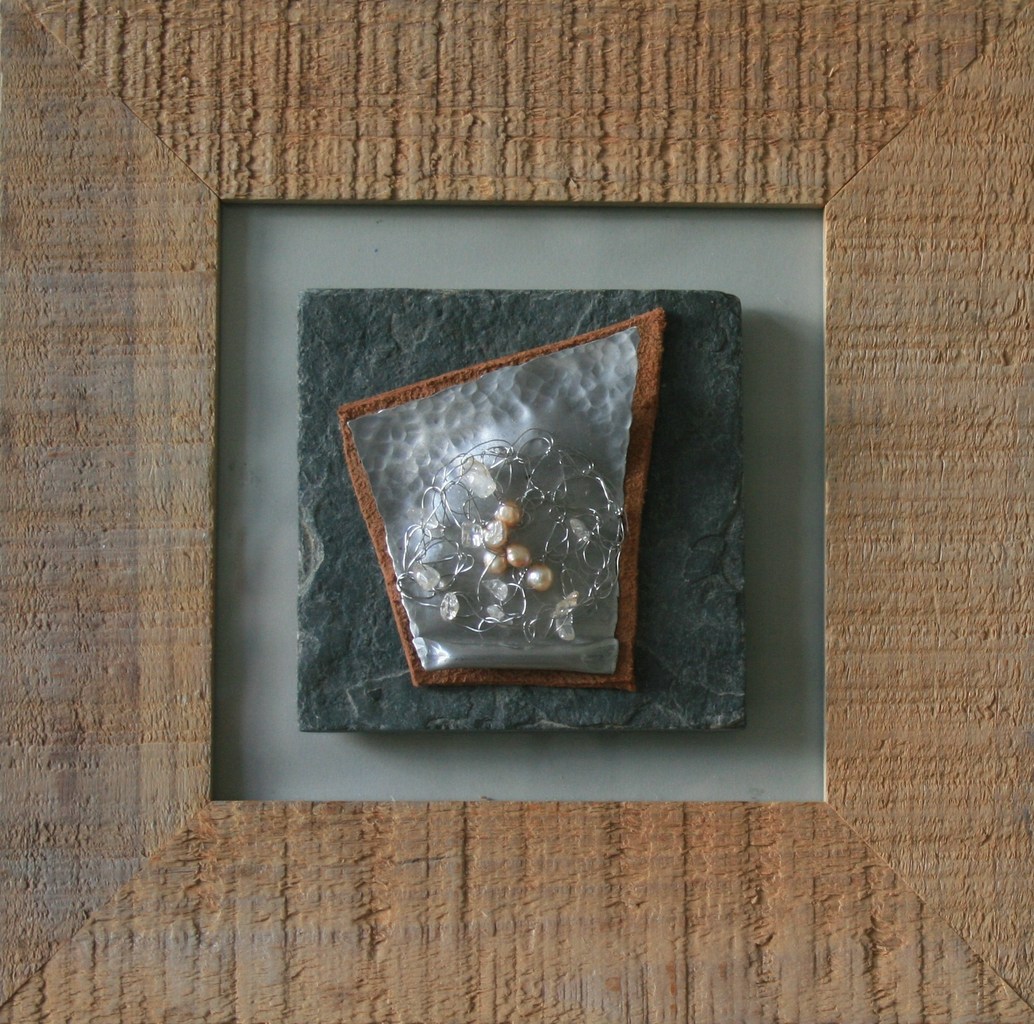 Een ruwhouten lijst met een leisteentegel met daarop een plaatje vervormd aluminium en leer. Hierop bevestigd een weefsel van RVSdraad met parels en citrien. Dit muursieraad kan ook zonder achterkant als doorkijkje worden opgehangen.