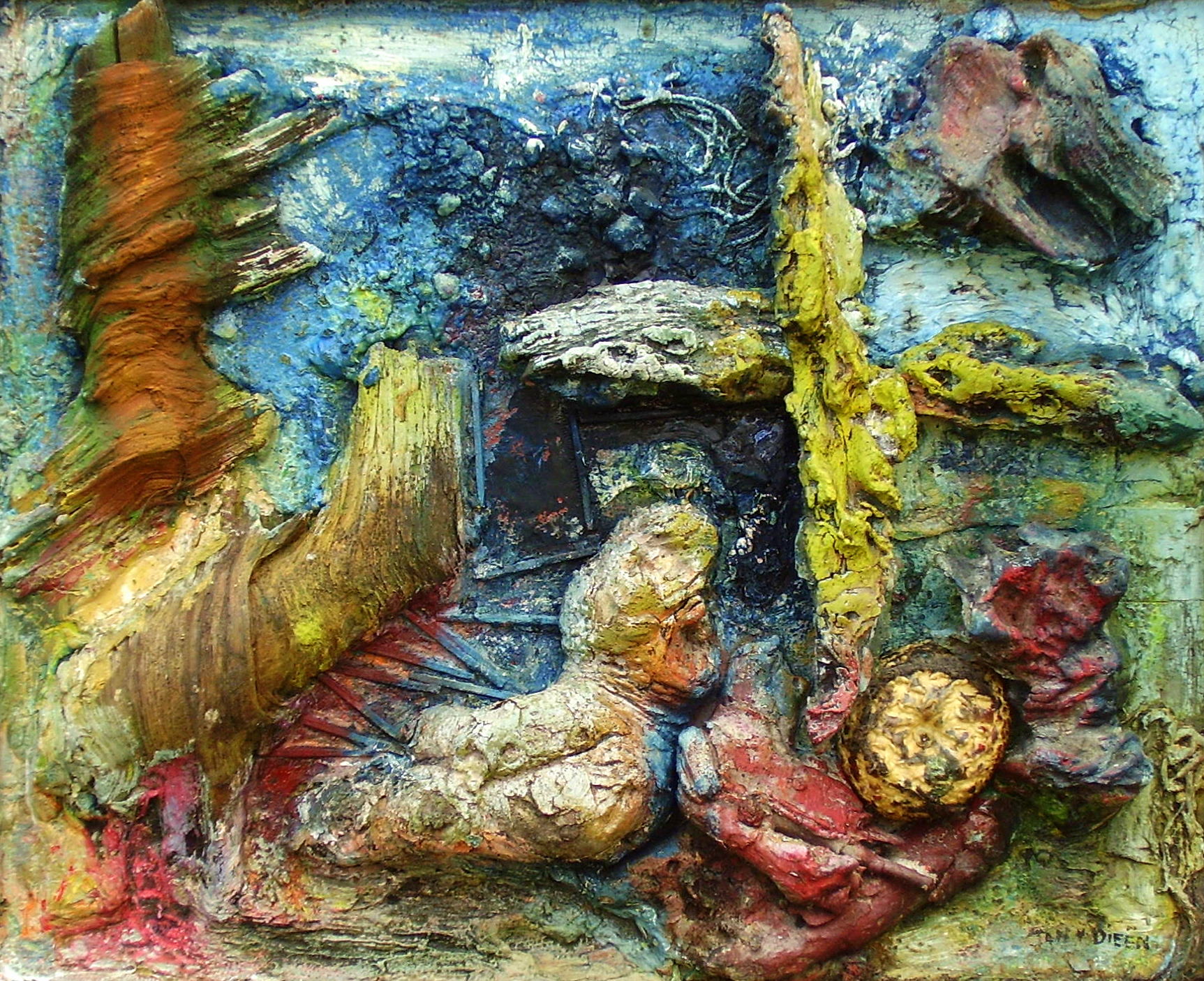 Ton van Dieën (1937), is een Intuïtief beeldend kunstenaar. Hij heeft zich in zijn lange leven op autodidactische wijze ontwikkeld tot een veelzijdig kunstenaar. Zijn werk bestaat veelal uit schilderingen op allerlei ondergronden. Wat er in zijn geest bedacht wordt, beeldt hij op zijn eigen wijze uit, met inkt, verschillende soorten verf of lijm op doek, hout, board of papier. Soms is deze kunstenaar zelfs zo geïnspireerd aan het werk dat er vanuit zijn eerste denkbeeld iets in 3D ontstaat. Deze 3D objecten bestaan uit velerlei restmaterialen of toevallige vondsten die op creatieve manier worden verwerkt.
