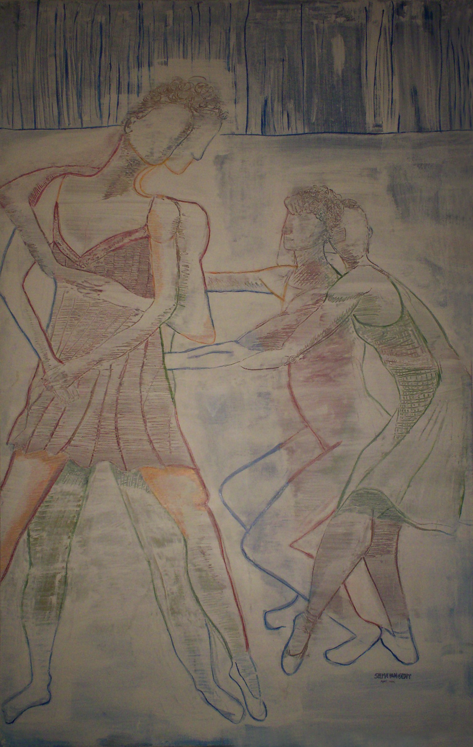 De kleuren op dit schilderij zijn de onderlagen, die zichtbaar zijn dmv wegkrassen van de witte verf (bovenlaag).