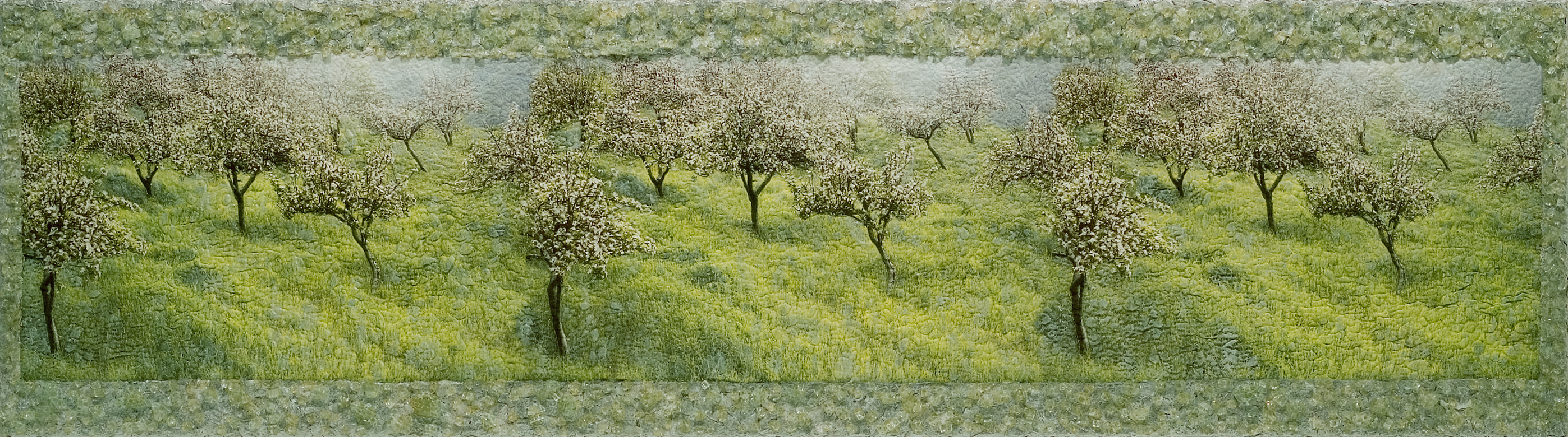 Helling met bloeiende amandelbomen in Andalusie (Spanje). Fotografie op textiel, met stikwerk, relief. Rand van stukjes glas