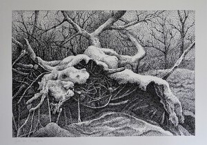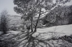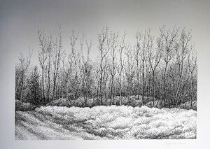 Maakt voornamelijk landschapselementen met voornamelijk bomen als thema en inkt en kleurpapier