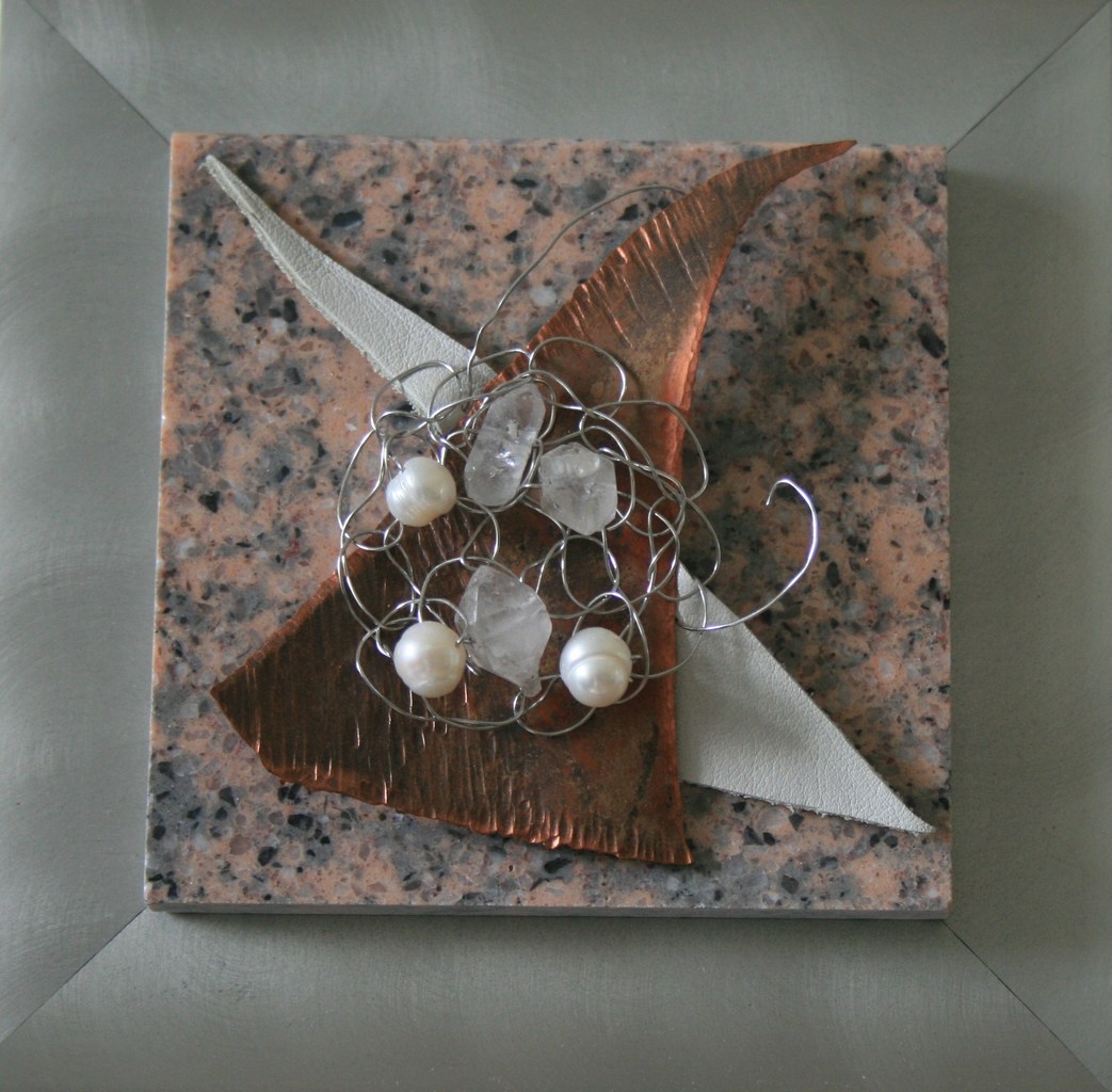 Een gehamerd stukje koperplaat met daarop een weefsel van RVS-draad met grote witte parels en punten bergkristal. Dit is met een stukje wit leer bevestigd op een tegelvormige steen, occhalino punto nero rose variant. Met de dikke RVS-lijst vormt het een eenheid.
