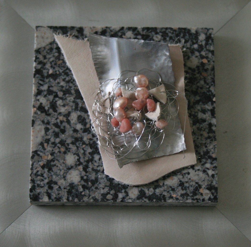 Een bewerkt RVS-plaatje met een weefsel van RVS-draad, rose parels en rhodoniet is op een stukje rose leer en een tegelvormige steen, occhalini punto nero, gemonteeerd. Dit is op een dikke RVS-lijst bevestigd en vormt hier één geheel mee.