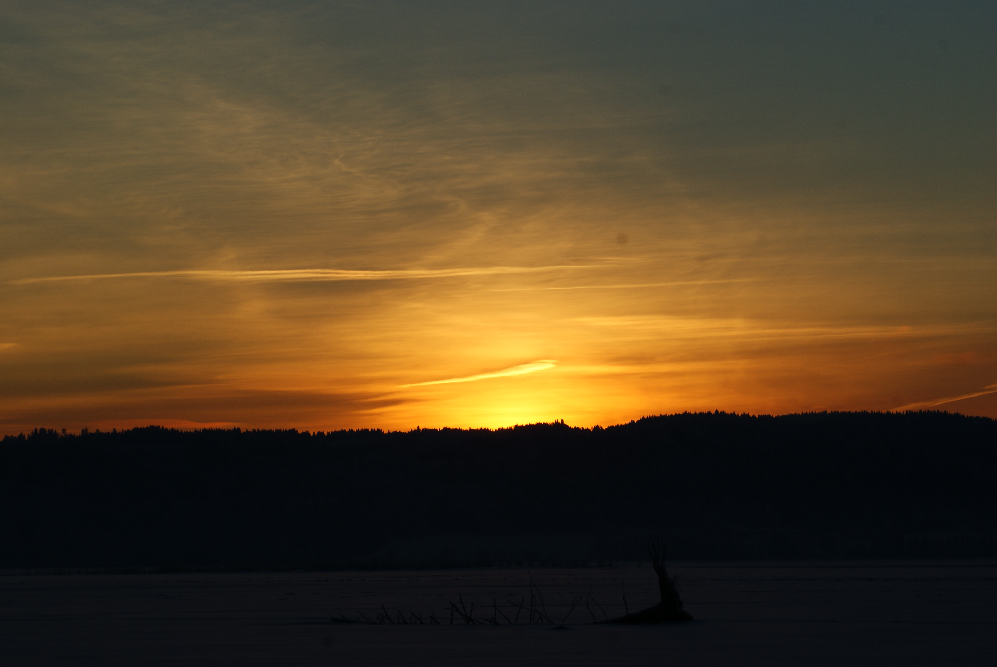 De ondergaande zon op het bevroren meer met een boom die geen kant op kan....