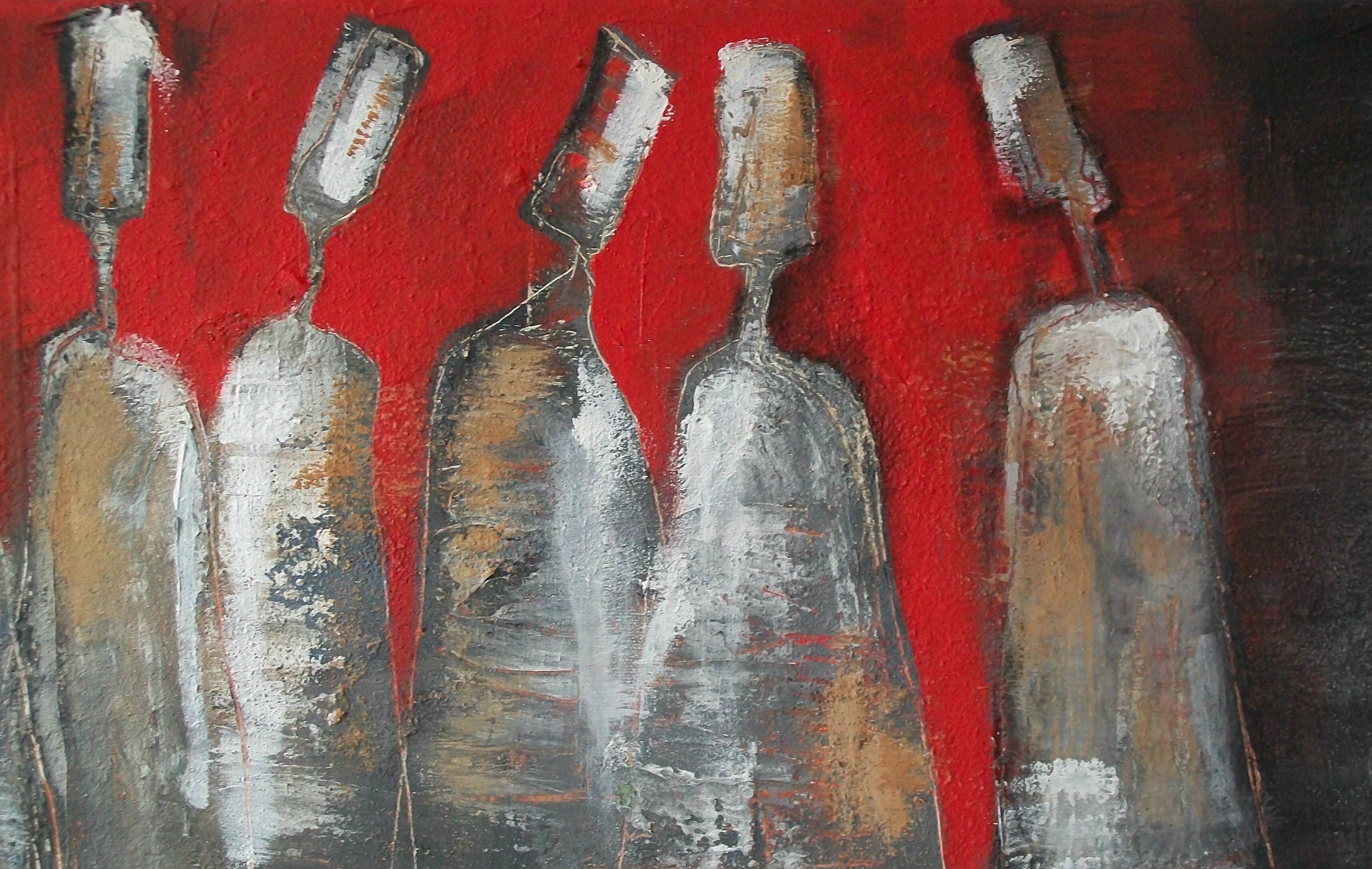 De techniek waar ik mij het meest vrij in voel is een combinatie van acrylschilderen en de collage techniek. Eindeloos experimenteren met vorm, kleur en emotie. De flessen worden steeds meer figuratief en drukken ieder een eigen emotie uit. Het gaat vooral om de interactie tussen de flessen/figuren. Eenzaamheid, hunkering naar 'erbij horen', uitsluiting, groepsvorming; allemaal emoties die mij fascineren.