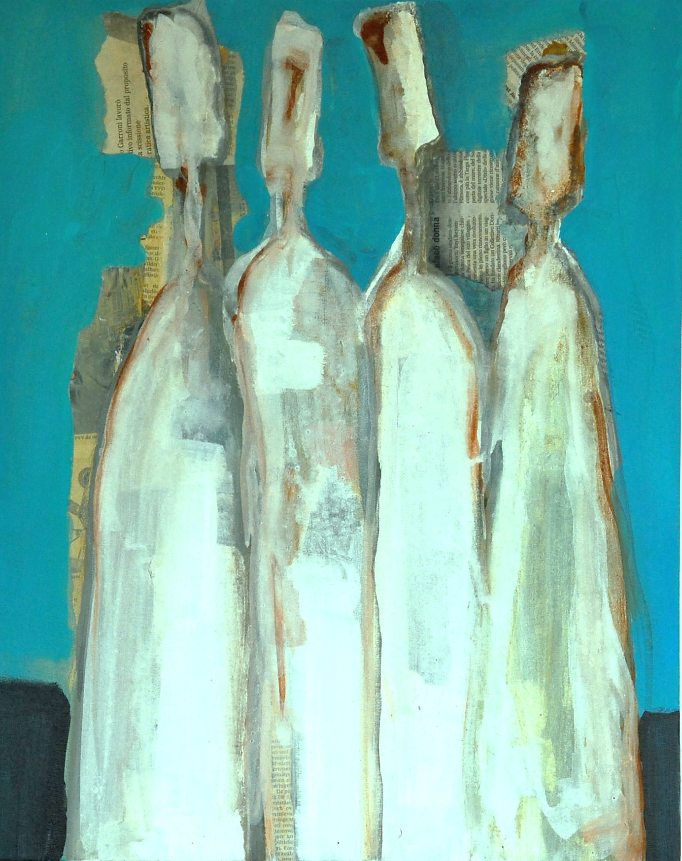 De techniek waar ik mij het meest vrij in voel is een combinatie van acrylschilderen en de collage techniek. Eindeloos experimenteren met vorm, kleur en emotie. De flessen worden steeds meer figuratief en drukken ieder een eigen emotie uit. Het gaat vooral om de interactie tussen de flessen/figuren. Eenzaamheid, hunkering naar 'erbij horen', uitsluiting, groepsvorming; allemaal emoties die mij fascineren.
