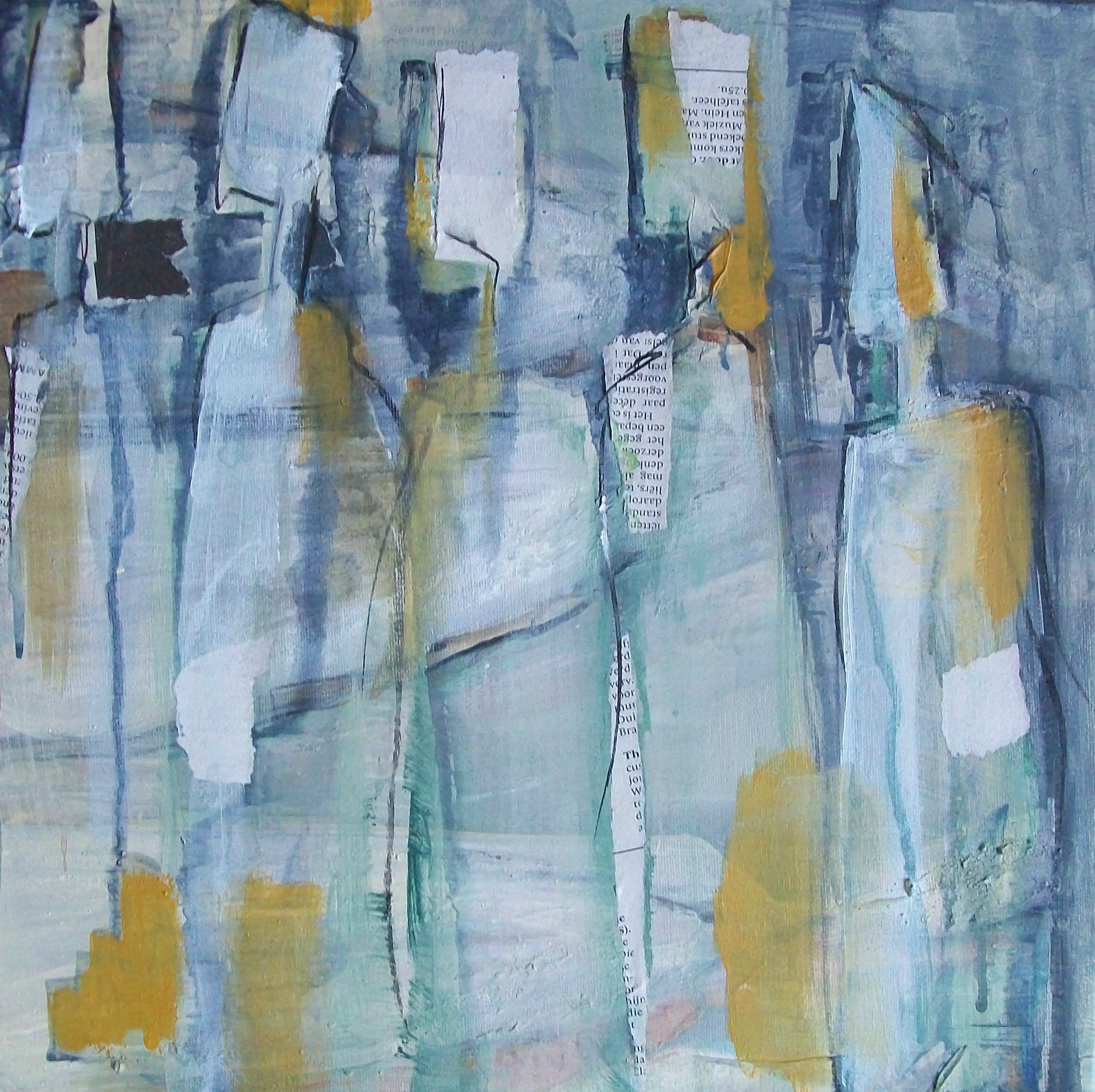 De techniek waar ik mij het meest vrij in voel is een combinatie van acrylschilderen en de collage techniek. Eindeloos experimenteren met vorm, kleur en emotie. De flessen worden steeds meer figuratief en drukken ieder een eigen emotie uit. Het gaat vooral om de interactie tussen de flessen/figuren. Eenzaamheid, hunkering naar 'erbij horen', uitsluiting, groepsvorming; allemaal emoties die mij fascineren.