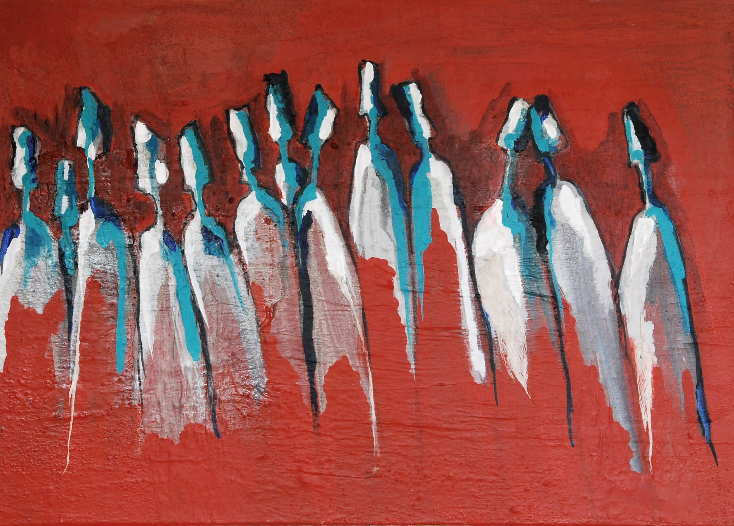De techniek waar ik mij het meest vrij in voel is een combinatie van acrylschilderen en de collage techniek. Eindeloos experimenteren met vorm, kleur en emotie. De flessen worden steeds meer figuratief en drukken ieder een eigen emotie uit. Het gaat vooral om de interactie tussen de flessen/figuren. Eenzaamheid, hunkering naar 'erbij horen', uitsluiting, groepsvorming; allemaal emoties die mij fascineren.