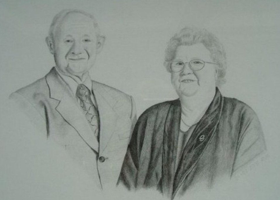 Hier zie je een potloodtekening van Opa en Oma Hazeleger, deze is met normaal HB potlood fotografisch getekend