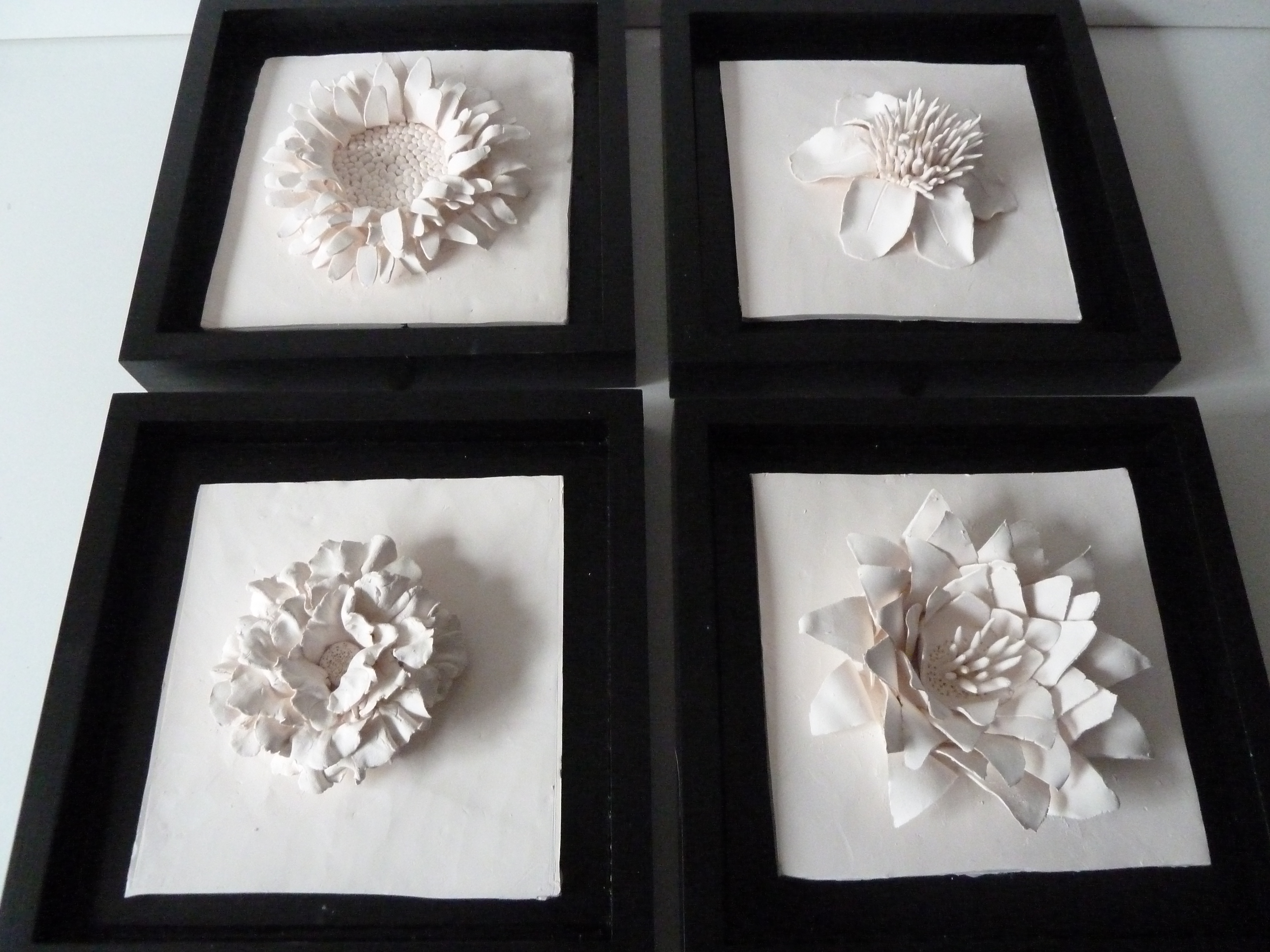 Witte ongeglazuurde bloemen op een poseleinen tegeltje in een zwarte lijst, ophangbaar , serie van 6 worden per stuk aangeboden.