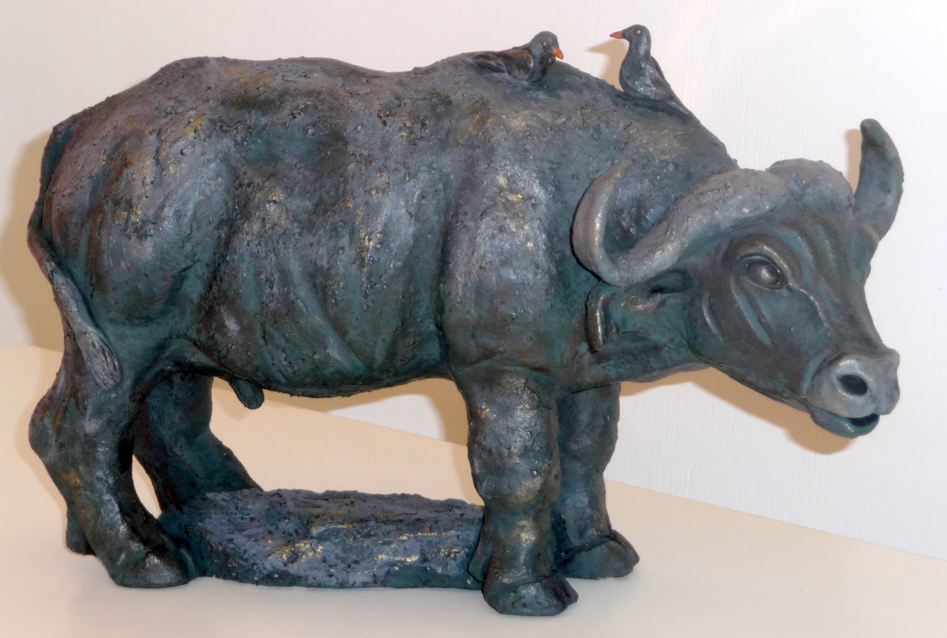 buffel met ossepikkers, handgevormde klei, gestookt op 1220º, steengoed bronskleurig beschilderd met acrylverf