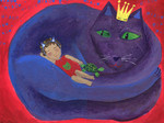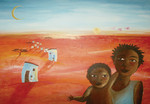 Jongetje wennend in een vreemd land, zijn moeder waakt over hem.