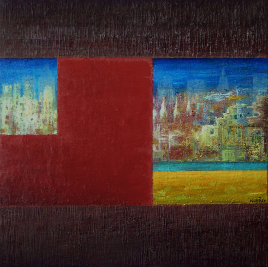 'Rood Gebouw' gaat over het bouwen van gebouwen op ongewenste natuurlijke locaties. De kleur rood heeft in dit schilderij een waarschuwende functie