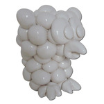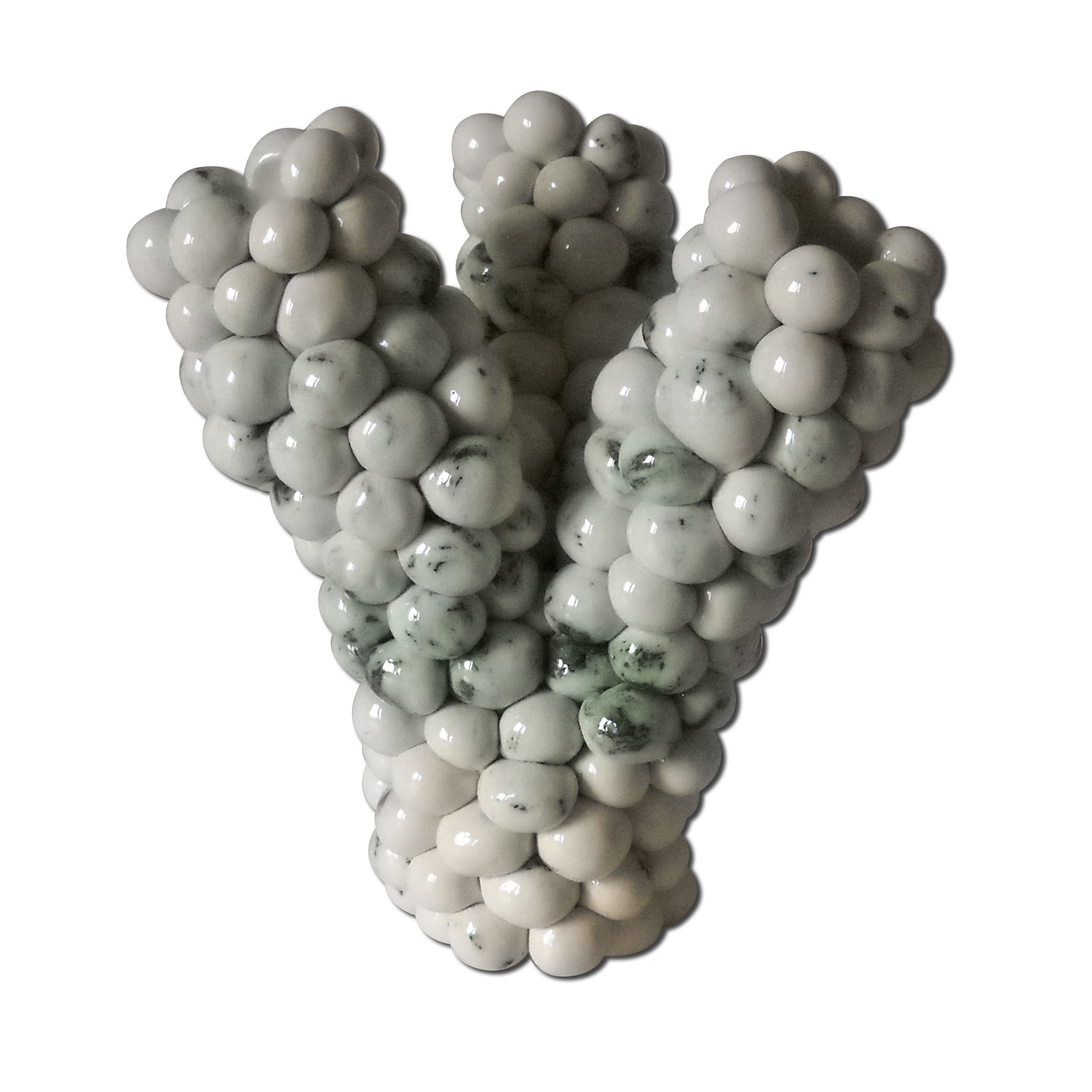 Werkwijze: Handmatig gerolde bolletjes met daardoorheen koperoxide en handmatig samengesteld. Materiaal: Witbakkende fijne chamotte klei met koperoxide gemengt. Deklaag: Transparant glanzend glazuur.