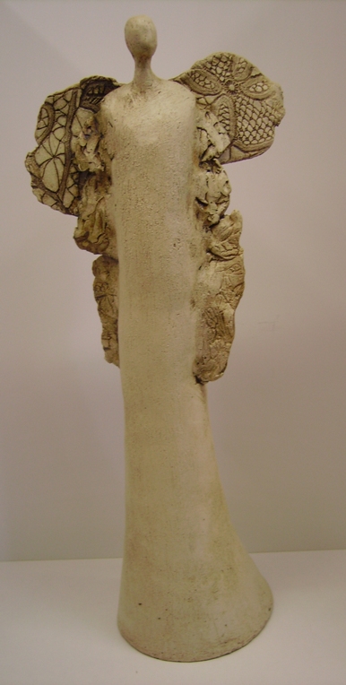 Deze engel is hooggestookt en met oxyde in gepoetst, daarna geglazuurd.