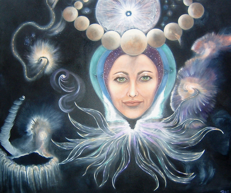 Dit doek stelt een Kosmisch Verbond voor. De techniek die ik heb gebruikt is gedeeltelijk de fijnschildertechniek. Het doek meet 1 bij1 meter