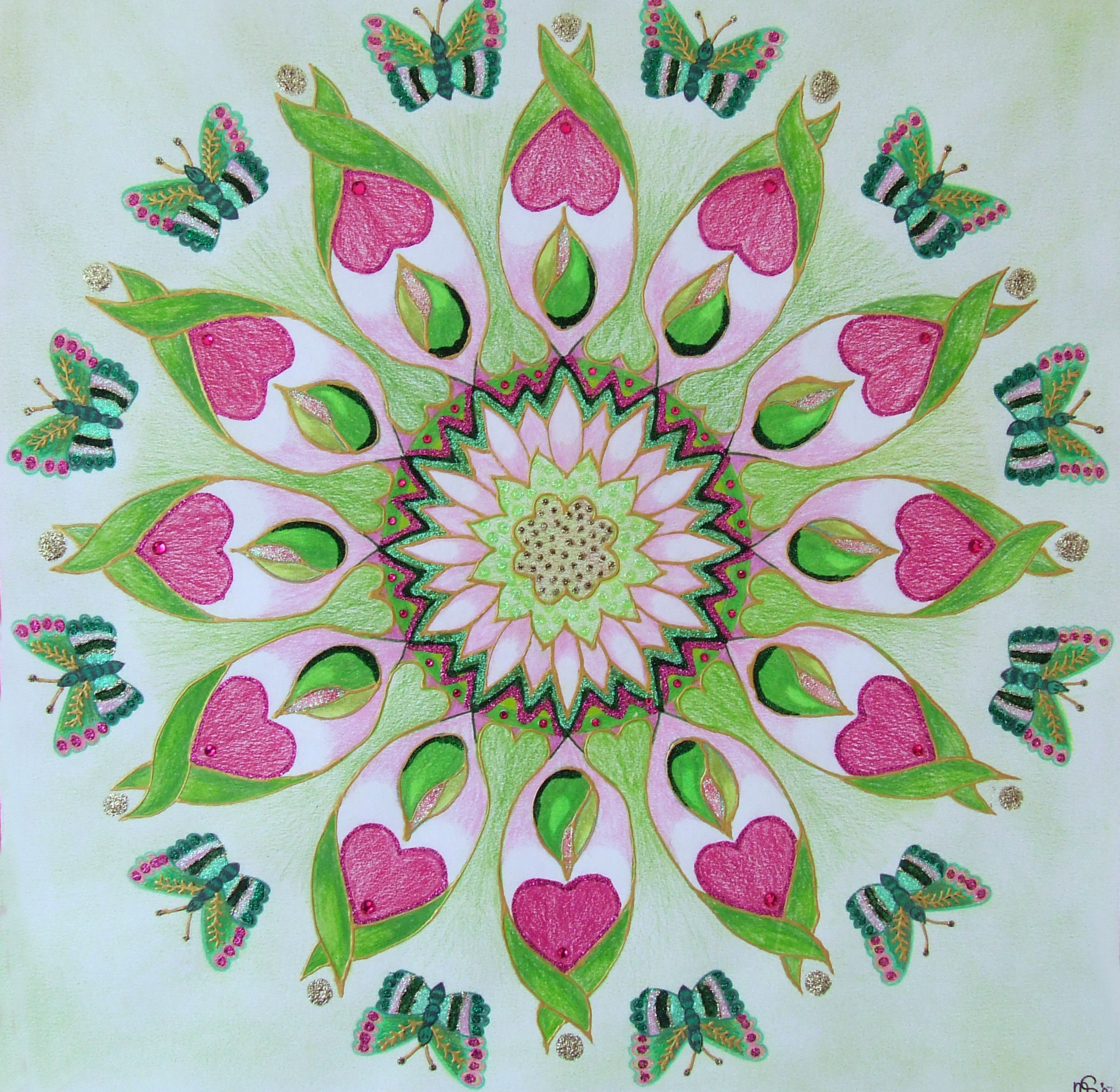 Hart chakra, getekend met potlood en bewerkt met glitters, strass steentjes en verf.