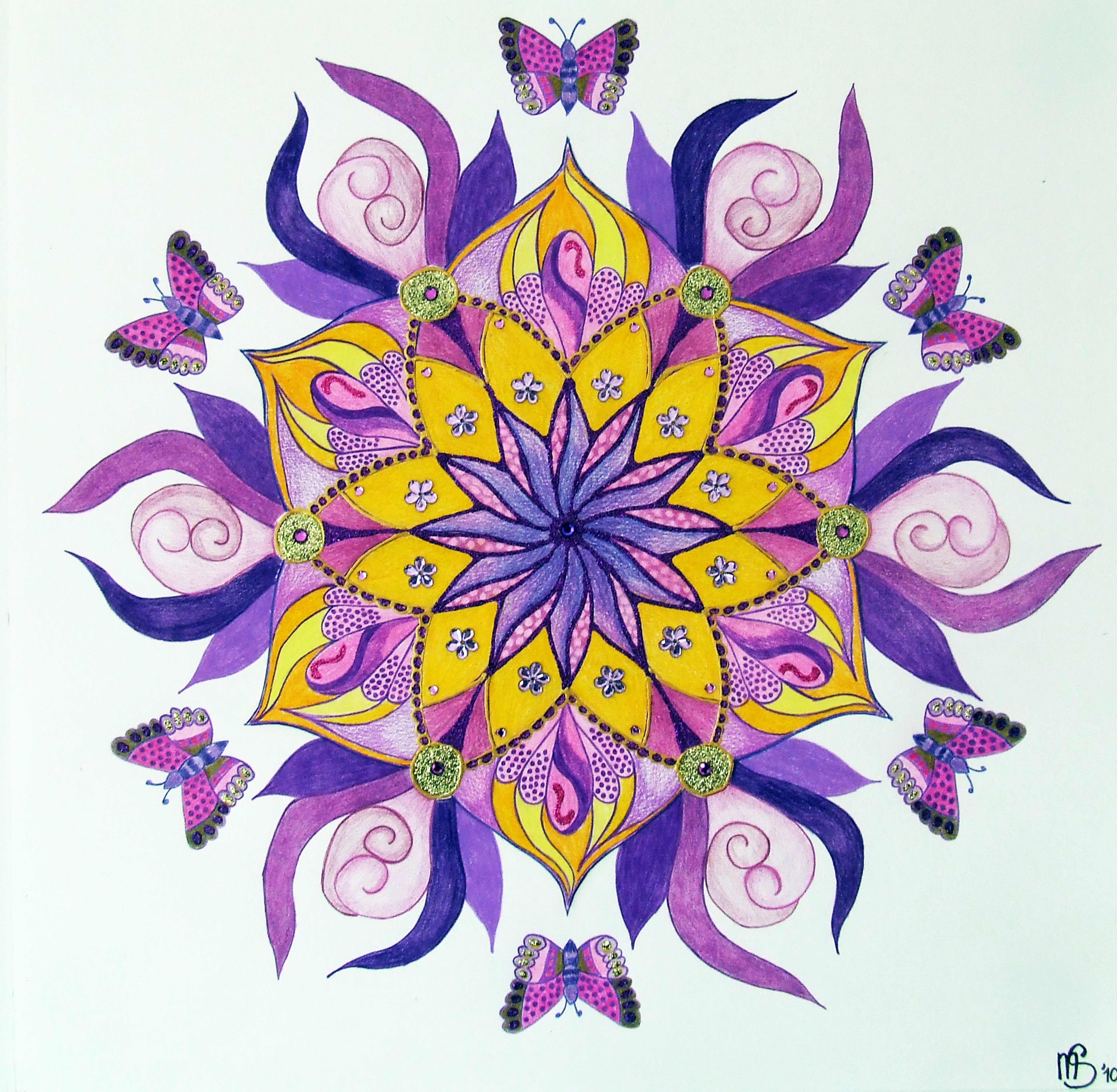 Kruinchakra in verschillende paarse en gele tinten,bewerkt met glitters, strass steentjes en verf.