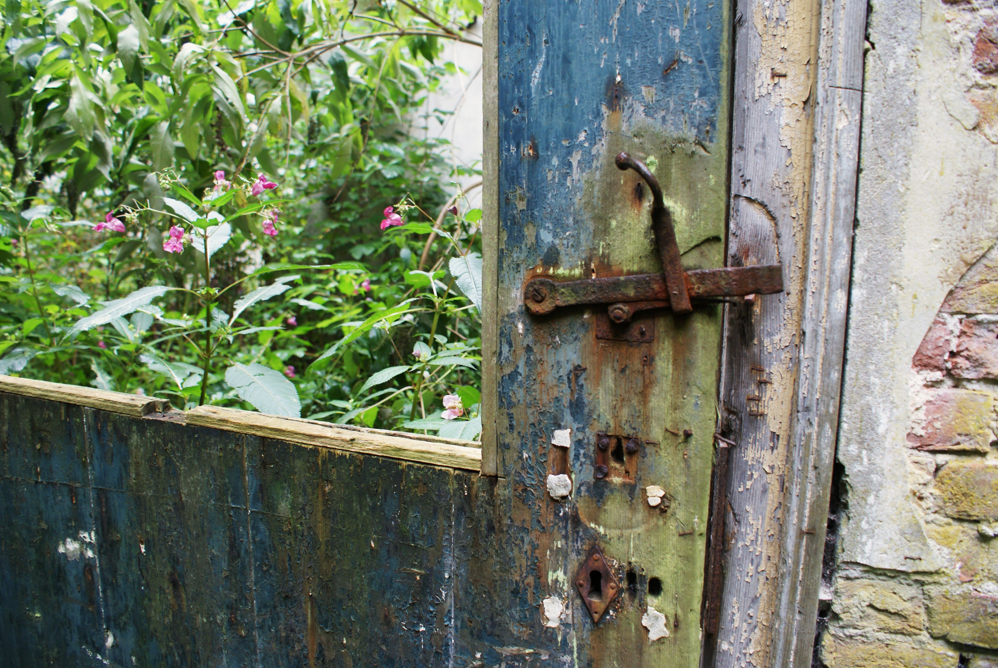 Het koetshuis van Landgoed Eikenrode is in zeer vervallen staat. Het is nauwelijks zichtbaar tussen de bomen en raakt meer en meer overwoekerd door planten en struiken. Koetshuis Nieuw-Loosdrecht: Deur.