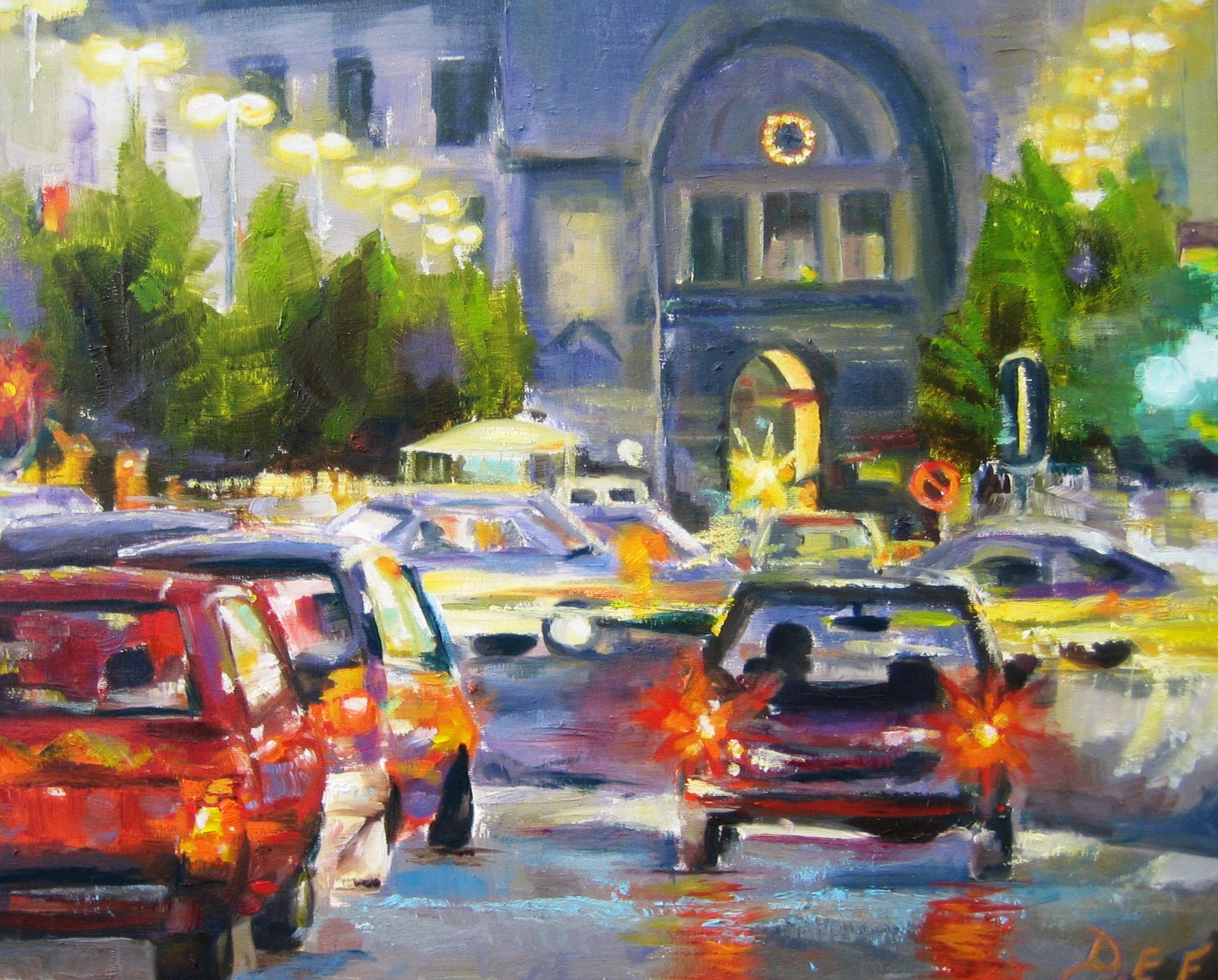 Schilderij Oranje Olieverf Auto Stad Station Antwerpen Centraal Drukte Keyserlei Avondspits