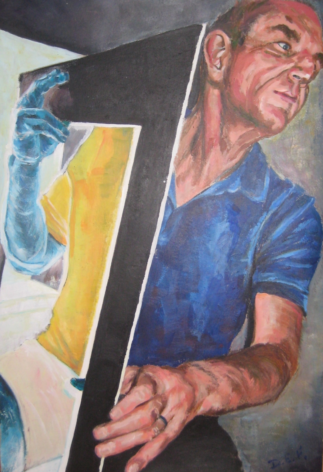 Schilderij Geel Blauw Acryl Twee Man Hand Negatief Arm Wereld Kader Francis Cis