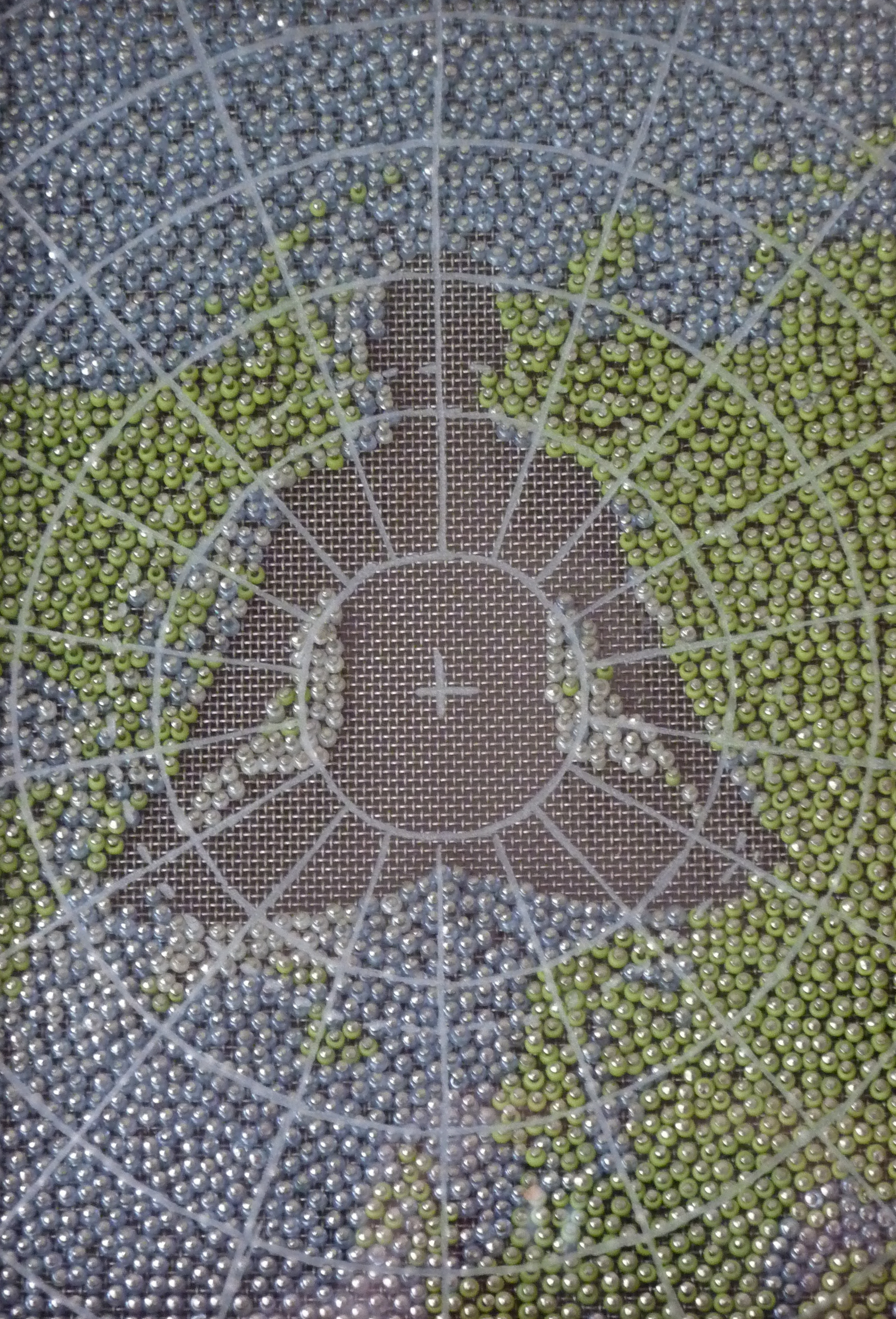 De vorm van de Boeddha is uitgespaard. Contouren van water en land (aardbol) zichtbaar gemaakt met spelden en glazen rocailles. Het glas is gegraveerd met de 'aardbollijnen'.