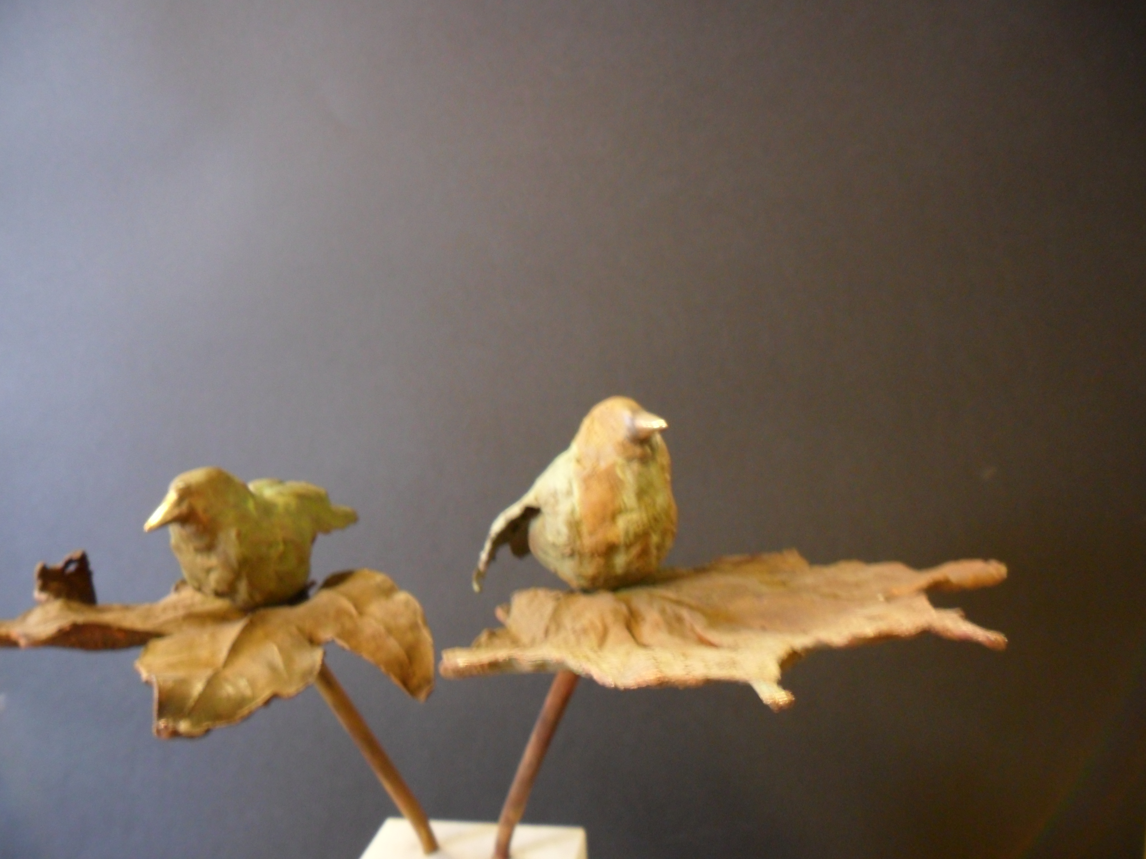 twee vogeltjes op elk een eigen klein blad van brons