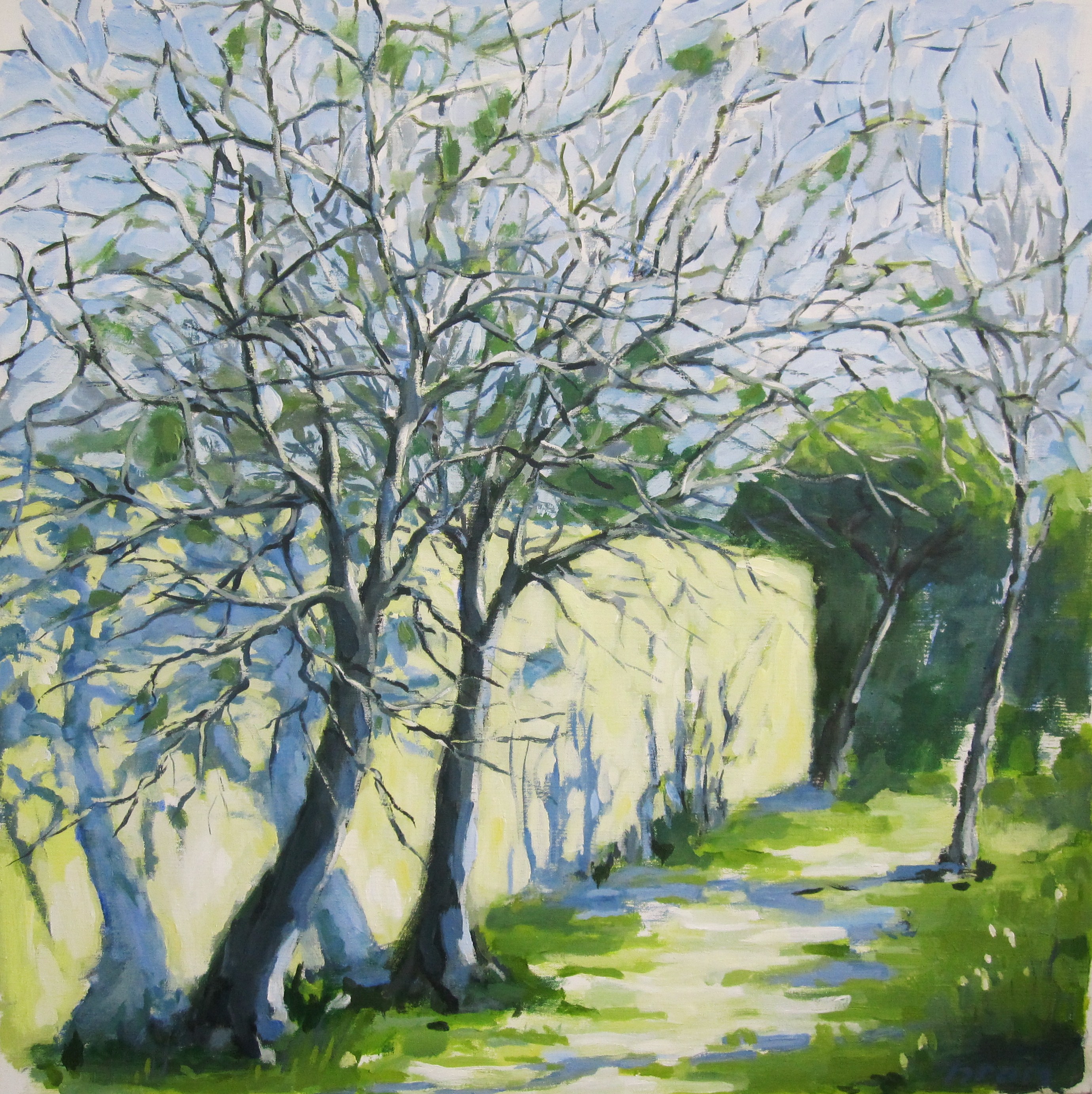 De takken van de amandelboom koesteren zich in de oktoberzon In metallic baklijst